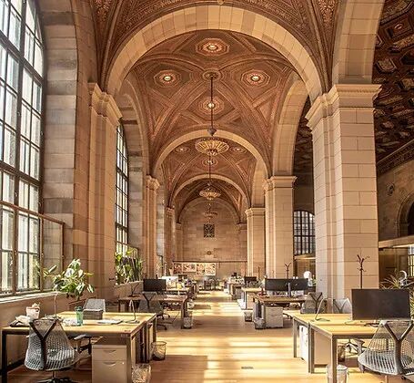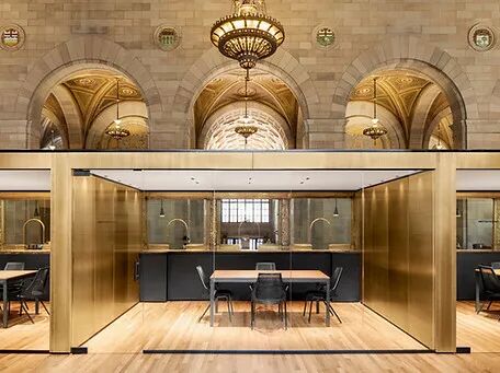 位于加拿大蒙特利尔的Crew Collective & Café曾是蒙特利尔老城区皇家银行旧址。建于1920年,这座历史感浓厚的保护建筑于2016年被加拿大Crew科技公司改造成一个有共享办公空间的咖啡厅,设计师保留了原建筑内富丽堂皇的大理石装饰和华丽的吊顶,加上优越的层高,改造后的Crew Collective & Café除了提供不同形式的办公空间,也可以承接包含公司团建,婚礼,发布会等不同形式的大型活动,并且这座保护建筑自身的历史感也吸引了不少剧组前来取景拍摄。同时,Crew Collective & Café也提供虚拟办公的服务,即允许会员使用皇家银行旧址的地址注册公司,皇家银行旧址优越的地理位置也成了注册公司隐形的名片。
