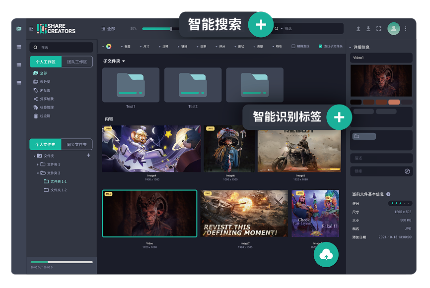针对海量数据进行智能化识别并提供多样的搜索条件,用户可以按颜色、名称、标签和其他属性进行搜索。这些强大的搜索功能不仅限于内部文件, 图片文件、PSD, 以及视频文件,还包括 URL、3D文件甚至Google Drive 等其他系统内的文件。