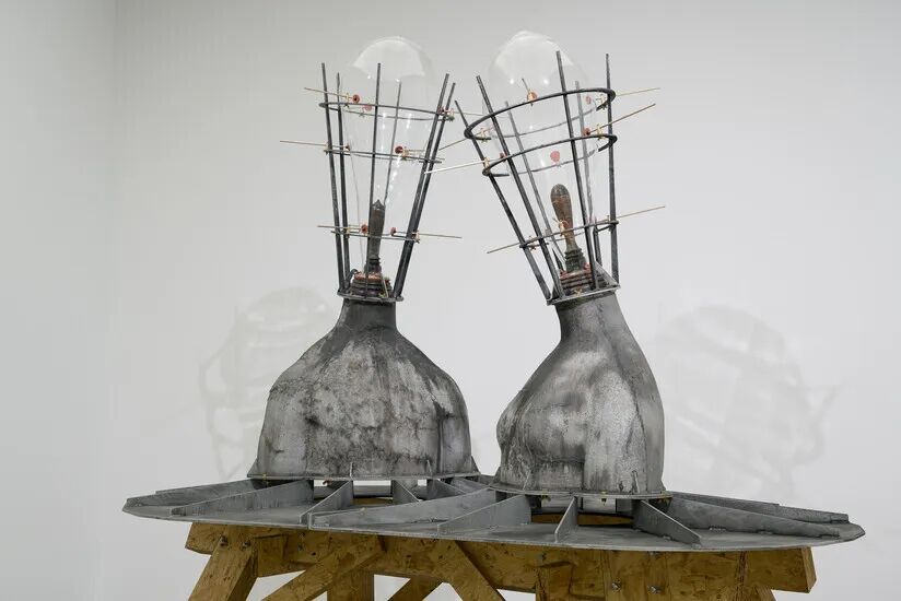 陆垒作品《被闪电击中的W&H》展现了巨人的狂野臆想,并不实际存在于现场的雷电,以幻想的形式被召唤至此地,在精神层面施加给观众强有力的感官刺激。