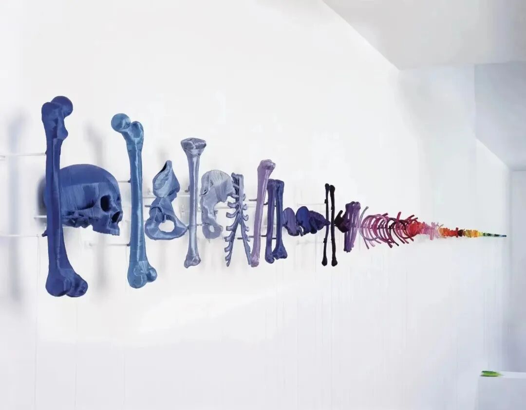 林天苗作品《都一样》是一套完整的、被拆散的人体骨骼,由大到小,被彩色的丝线所缠绕,彩色的丝线象彩虹的颜色过度。无论人类的阶级地位、贫富、人种的差异多么不同,其结果都是一样的。经过彩色丝线的包裹、重组和排列,使每一节骨骼的“生命”得以重生。