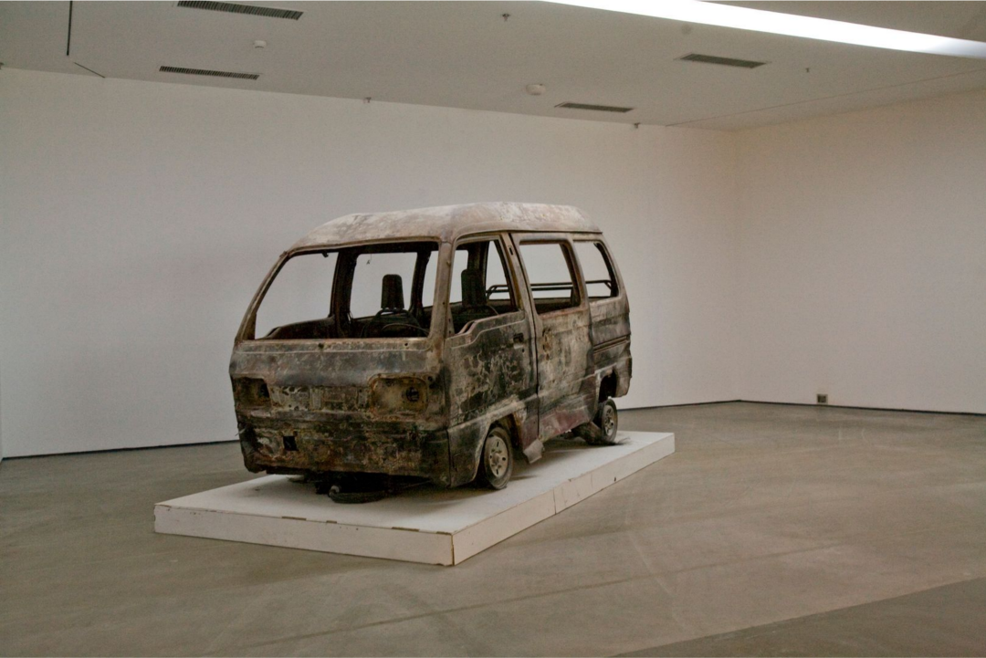 在张培力作品《现场报道:物证一号》中,观众在观看汽车残骸的同时,也能在大屏幕上看到车子周围――包括他们自己――的景象。这辆烧焦的车既是过往事件的证据,也是在场的现场物证。此作品是艺术家十年来对互动影像装置的实验的产物,探讨媒体暴力、商品崇拜、屏幕文化、认知障碍和事件现场感之间的关系。