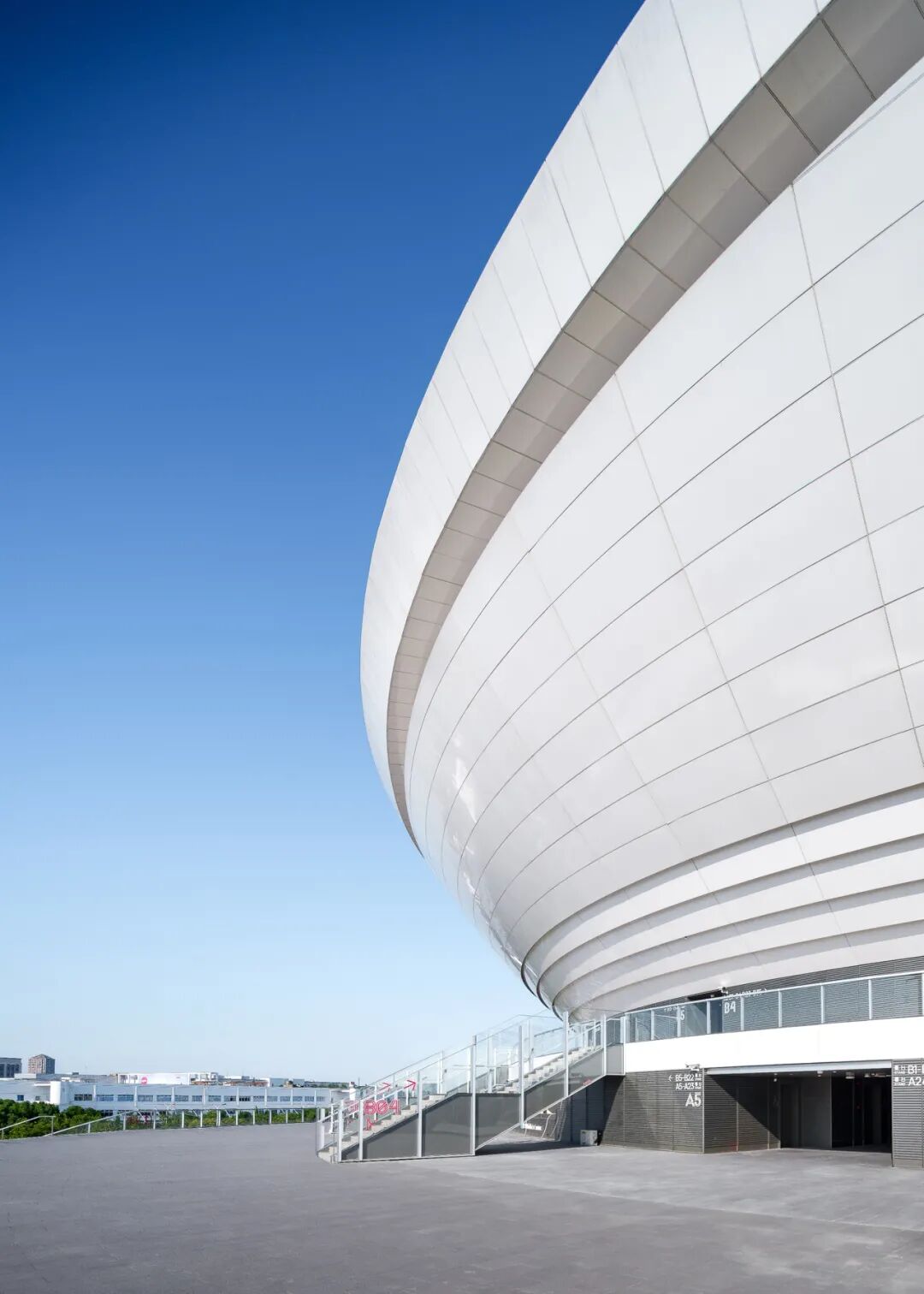 浦东足球场的造型概念源自中国的传统瓷器“白瓷碗”。球场如同一只精致的器皿,以细腻匀净的白色金属材料作为建筑表皮,呈现出如同白瓷般清透圆润的效果。在屋顶设计方面,设计师采用了中置压环的轮辐式拉索结构,将材料的力学性能最大化,为全球首例。