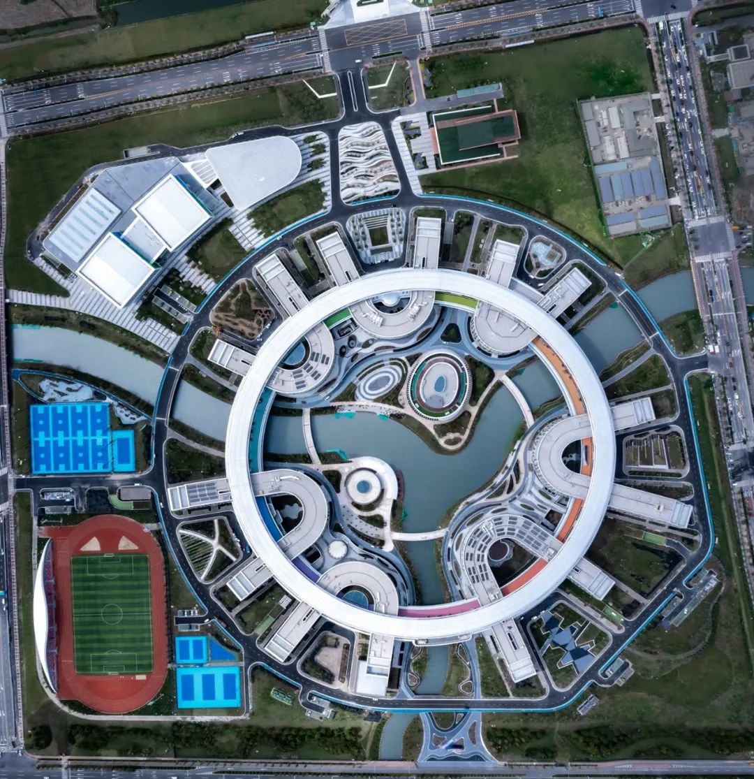 与传统的核心式、线性式、分叉式结构相比,超大尺度环状结构在保持自身连续性的同时,与周围建筑紧密相接,完整串联起各个层级的功能空间,形成综合而扁平化空间组合。同时圆环也界定了内外空间关系:外部空间面向城市,而内部空间则创造了一个桃花源般的校内世界,形成了清晰的内外对比。