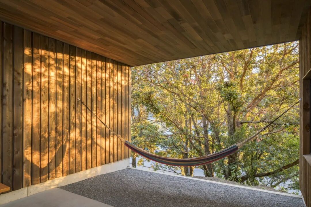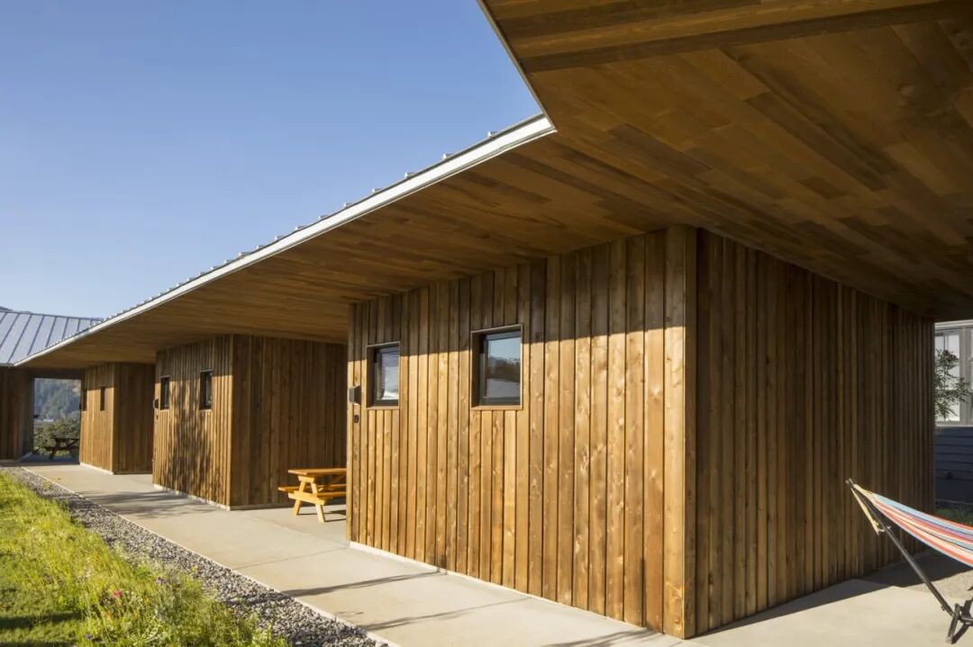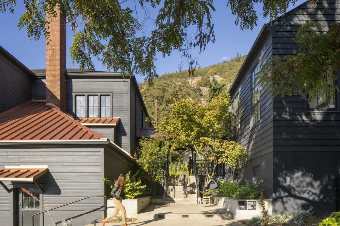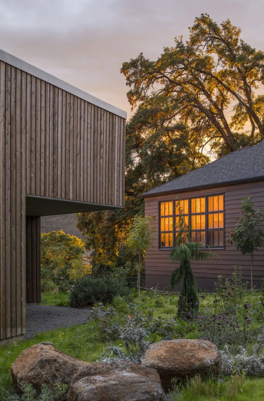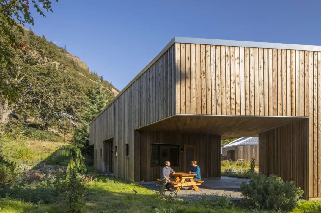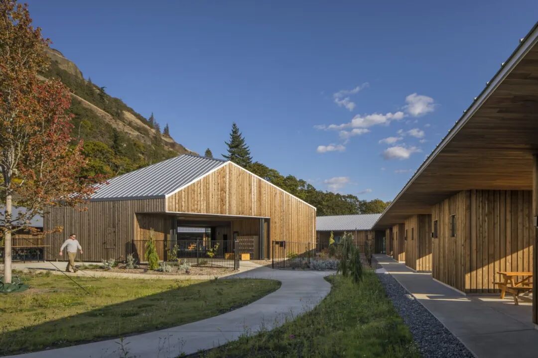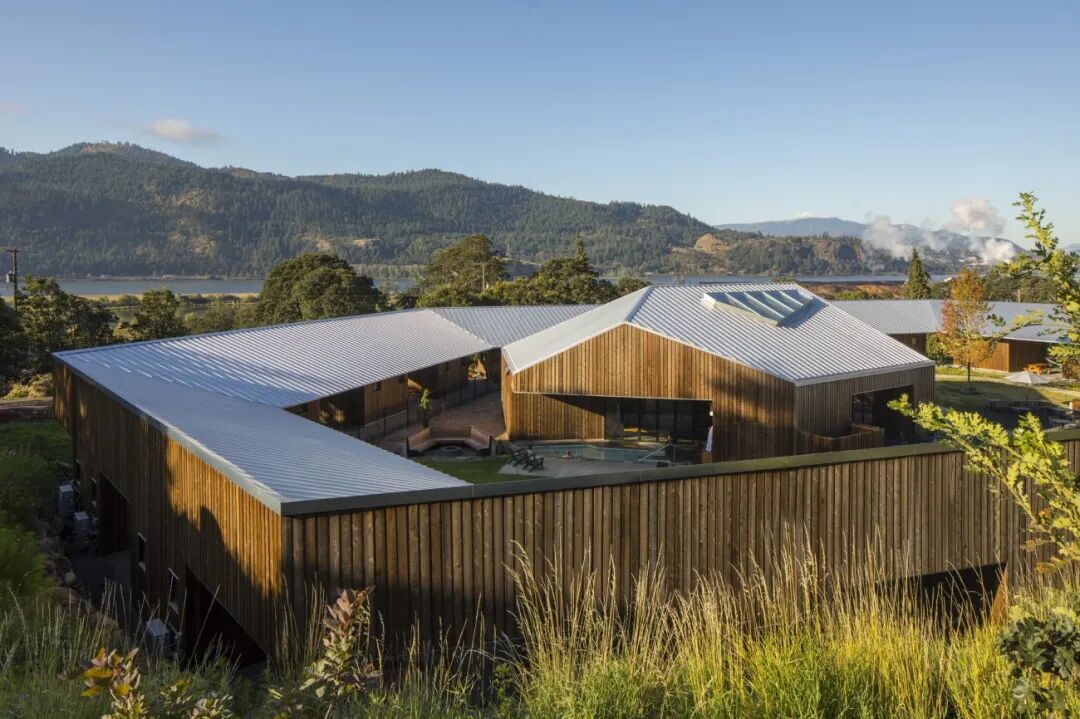 华盛顿宾根的宾根社会酒店位于美国风景名胜区哥伦比亚河峡谷,靠近滨水区,但被一系列工业设施隔开,这座占地2.57英亩的酒店位于住宅区内,对外开放的同时需要保护周围居民的隐私,这对酒店与周围景观的设计将是一项挑战。为了最大限度地发挥酒店与自然环境的关系,同时缓冲其对周围环境的影响,该项目探索出“编辑全景”的概念,使前台酒店庭院和峡谷背景之间的联系被加强,并且增强体验感。