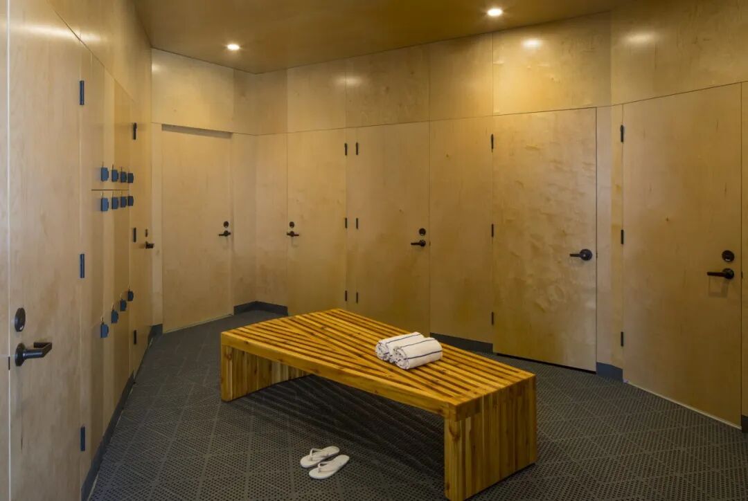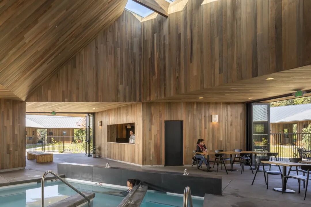 Within the ring, a community spa building serves as a central gathering space with shared amenities for the hotel’s visitors. The spa maintains the same material palette to the surrounding cabins, yet has a distinctly volumetric form. Avoiding a singular front entrance, the building instead opens onto each side of the ring. On its interior, the structure expands upward to a large skylight, which washes light over a series of pools below. while additionally containing more private areas, including changing rooms, sauna, kitchen, and massage rooms.