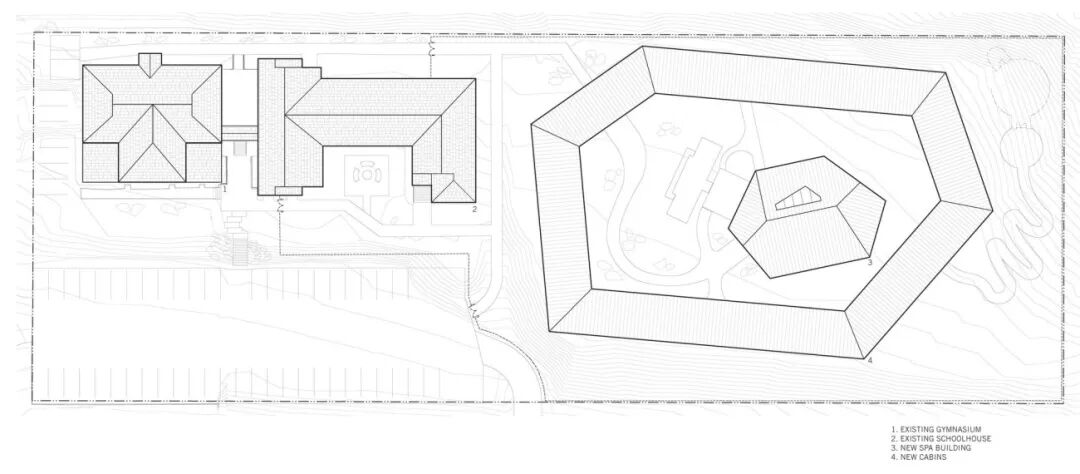 该项目由四个不同但相互关联的部分组成:需要改造的老学校、二十间酒店小屋、一条通道和一个水疗中心建筑。在学校的改造中,主要的设计难点是小屋、通道和水疗中心的重组工作,需要占据更大的场地,在这个方案中,各个小屋形成一个环形,松散地定义了场地的边缘。虽然每个居住单元在地面上都是独立的,但它们可以通过一个共享的屋顶连接在一起,这个屋顶悬臂出来,作为有遮蔽的走道和小木屋的门廊。