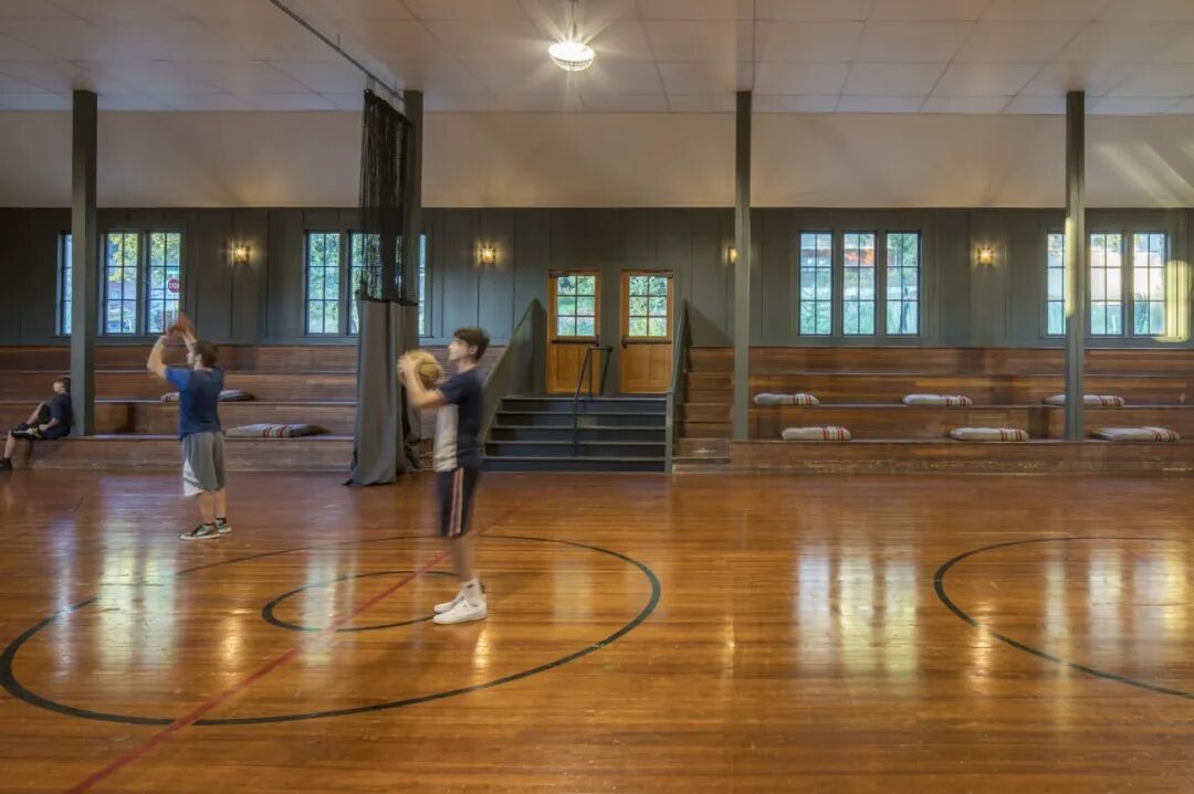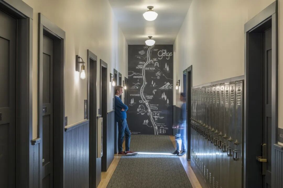 Originally built in 1903 and rebuilt in 1937 following a fire, the nearly 90-year-old Bingen Schoolhouse offers 10 private standard rooms and two 24-bed hostels, as well as a library in the reception area, lockers in the hallway and a refurbished gym open to guest use. The floors are all original to the building and a combination of existing or salvaged from the former classrooms to get the entire lobby to match.