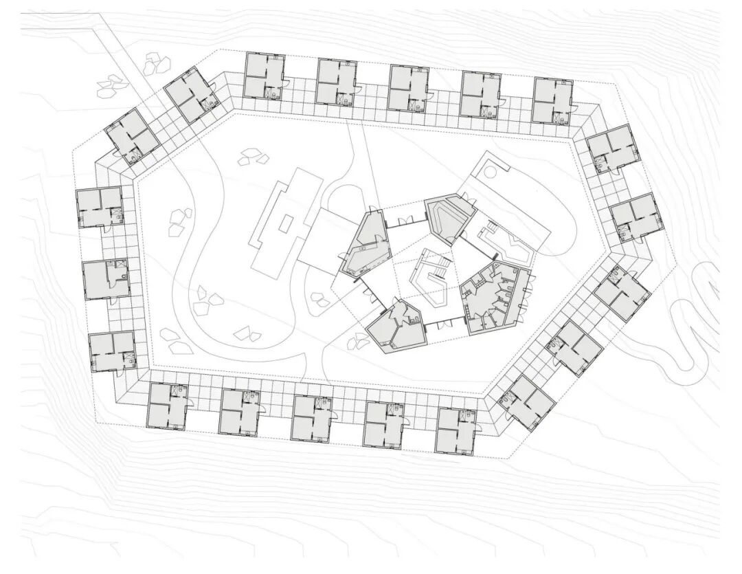 小屋的圆环结构构成了一个共享庭院,通过其相连的屋顶,这个圆环起到了框架的作用,人们向上可以仰望天空,向下可以俯瞰丘陵,游客也可以看到双重视角——庭院花园的近景和景观的远景,即使是在城镇环境中,也能提供一种隐逸感。同时,这一新的小屋周边提供了社区和酒店之间的清晰界限,同时保持了居住规模,避免了社区之间的单一障碍。