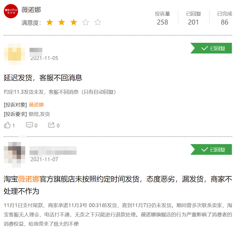 但是它也成为投诉量最大的品牌,在黑猫投诉上有258条,接近一半都是双十一期间发起的,而且大多是关于虚假发货。