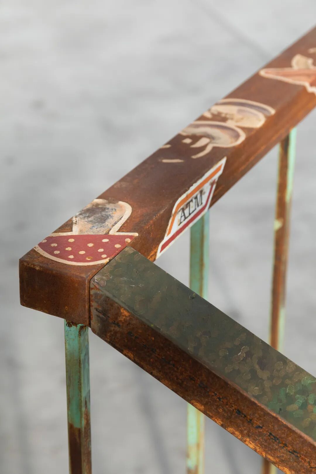 铁路研究#2(马其顿),2017 年,油画、丙烯酸、喷漆、铁扁杆上的滑板划痕,48 x 160 x 20 厘米