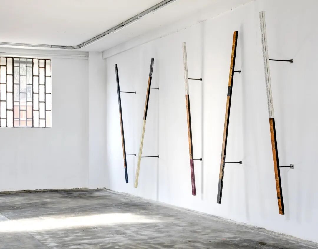 雅各布回到镇上 #5, 2018 铁底漆、油漆、铁条上的滑板划痕 300 x 8 x 4 厘米