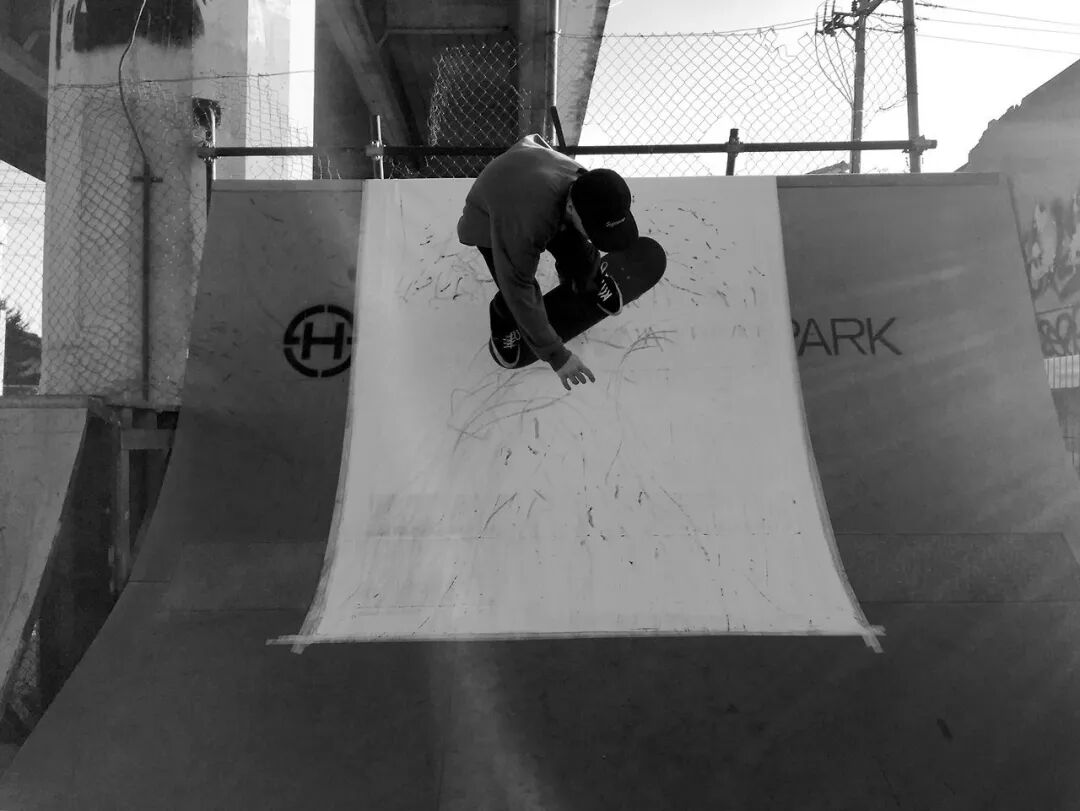 清空垃圾桶,2017,喷漆,油画,棉布上的滑板痕迹,200 x 150 厘米