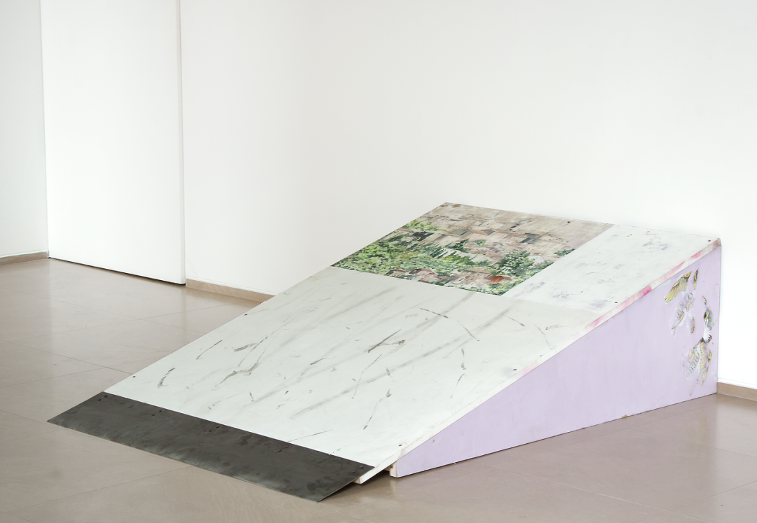 无题踢球者(与蒙特普尔恰诺), 2017, 油画、丙烯、喷漆、滑板痕迹、沥青、肮脏和铁板在木制踢脚坡道上