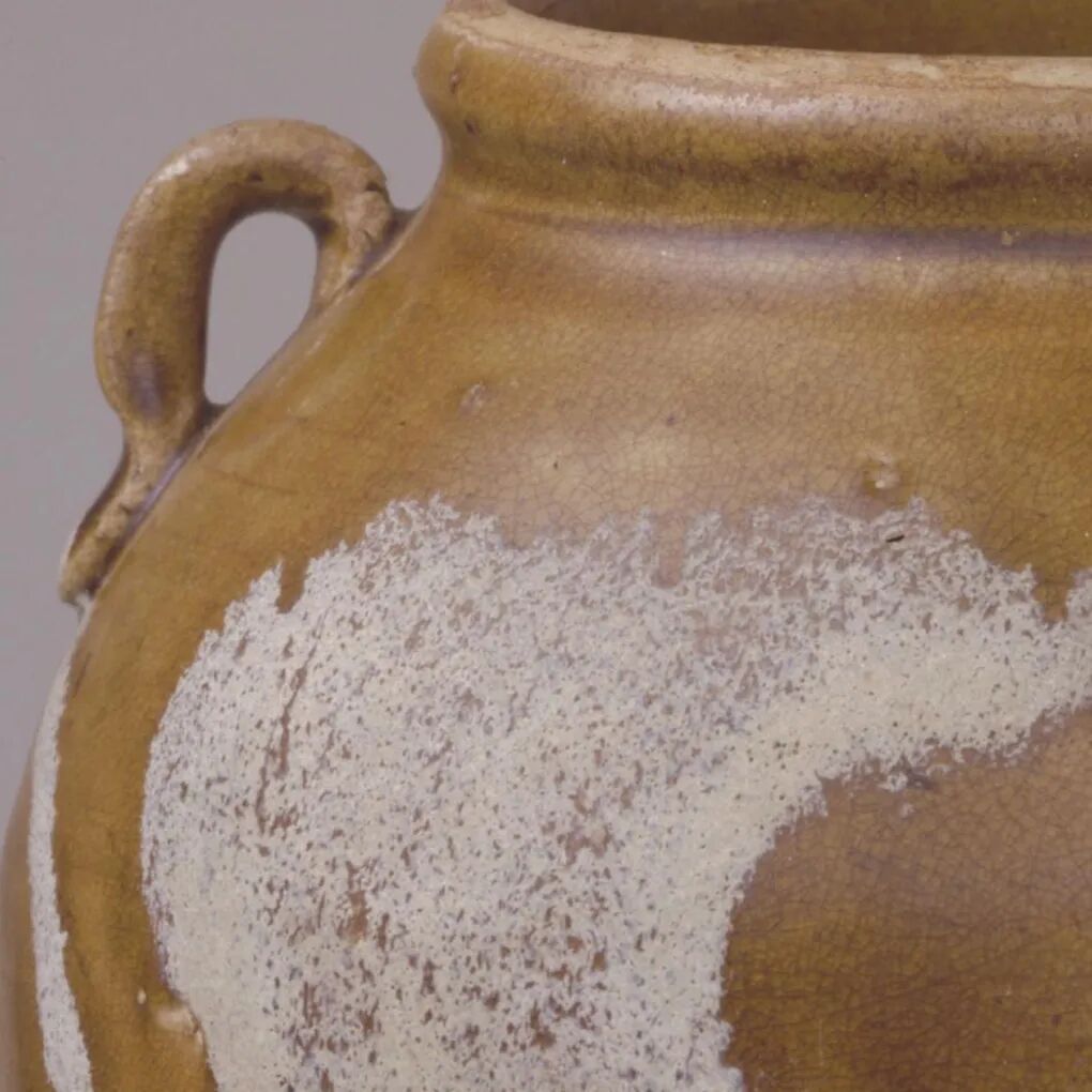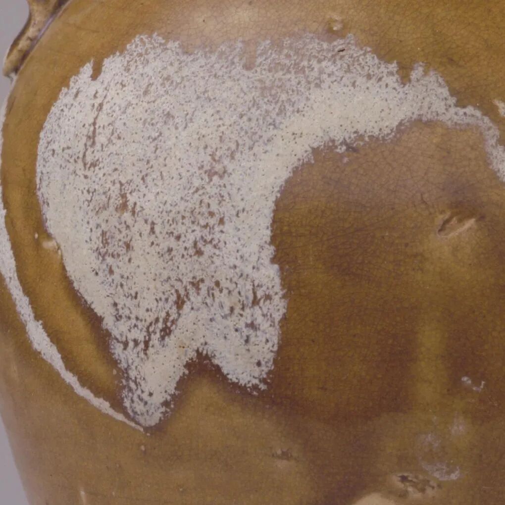 罐唇口,溜肩,平底,肩部对称立起两系。里外施釉,外部施褐黄色釉不到底,其上有灰蓝色彩斑4块。