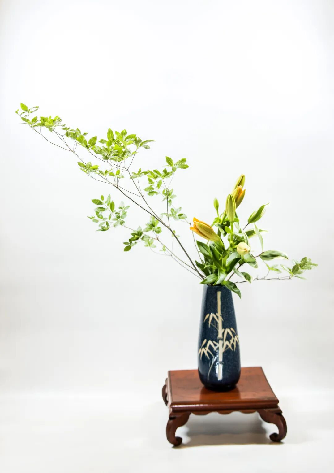 投入花没有专门的固定方式,根据瓶口形态可以直接投入,也可以借助一些竹针,或可以使用到一字形或十字形的枝条作瓶口的分区。在插作时要分出主枝、副枝与添。主枝是结构与框架,副枝是补充与布局,添则是根据每个人的审美要求自由发挥。
