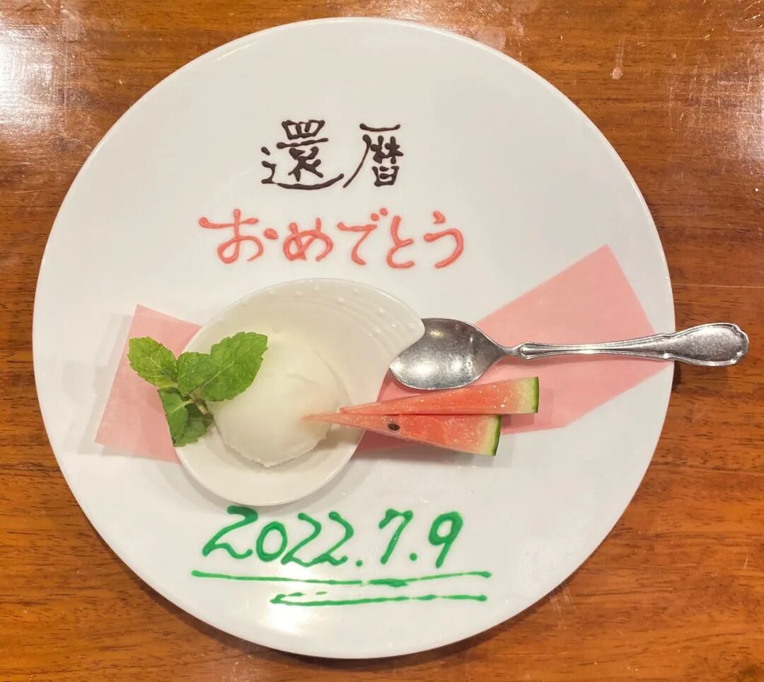 生日冰激凌上面写着“还历”,下面注明着我的生日:“2022.7.9”。从1962年到2022年,在中国就是“一甲子”,在日本就是“还历”。