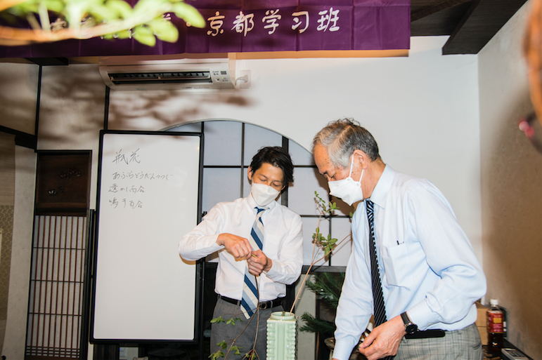 课后,我们陪两位老师去京都清水寺附近的一家名为蟹家的餐馆用晚餐。上村先生介绍了自己学习插花的经历。在正式插花之前,上村先生就与日本著名的文化史学者工藤昌伸交往甚笃,而与工藤昌伸相识的人中就有包括小原流和宏道流等花道流派的家元。在与宏道流七代家元望月义琮先生认识并交往了四年之后,有一天,望月先生对上村先生说:“跟我们一起来插花吧,我觉得你会插得很好的。”就这样,上村先生开始了自己的插花生涯,直到现在,已经有了三十多年的插花经历,才有了“为了立起第一枝,花了整整十二小时”的经验之谈。