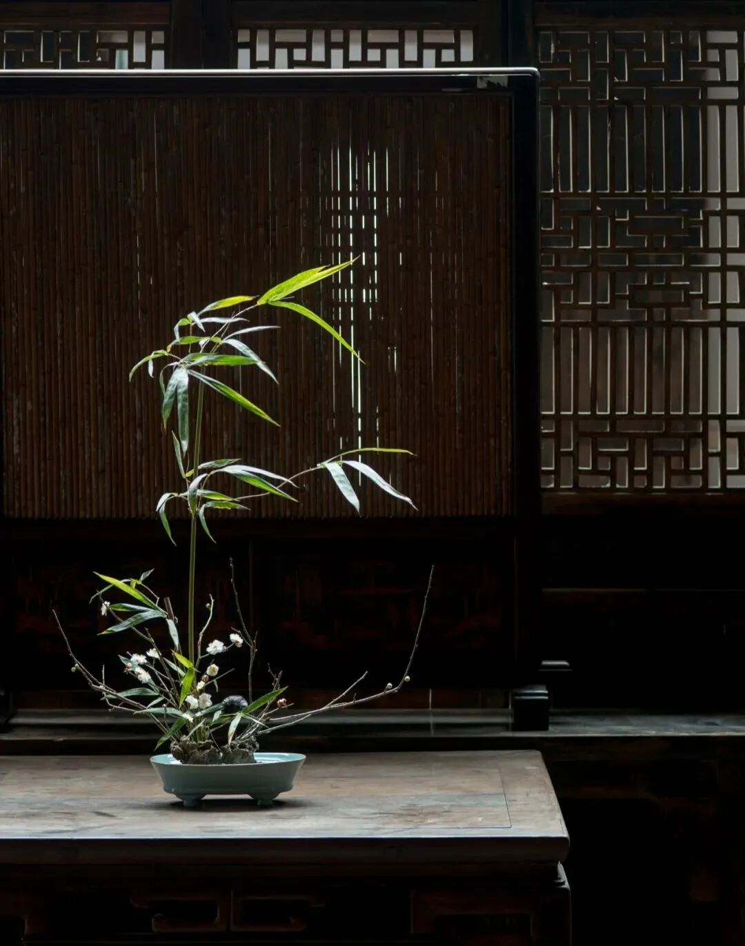 插花虽小道,而对于器具却不可随便乱用,明代袁中郎的《瓶史》中曾说:养花瓶亦须精良,譬如玉环飞燕,不可置之茅茨:又如嵇阮贺李,不可请之酒食店中。尝见江南人家所藏旧觚,青翠入骨,砂斑垤起,可谓花之金屋。其次官哥象定等窑,细媚滋润,皆花神之精舍也。据他的看法,大概插花还是以铜瓶为上,所以有青翠人骨,砂班垤起之说,而磁瓶次之,即使是名窑,也不得不屈居其下。但我以为也不可一概而论,譬如粗枝大叶的花,分量较重,插在瓶中易于翻倒,自以铜瓶为妥善。记得去秋苏州怡园开幕时,我举行盆栽瓶供个人展览会,曾用一个古铜插一枝悬堂的批把花,枝于很粗,主体一枝,另一枝斜下作悬崖形,而叶子十多片,每片好似小儿的手掌般大,俏用瓶或陶瓶来插,定然不胜负担,因此不得不借重铜瓶了。今年元宵节。我从梅丘的一株铁骨红梅树上,折了一枝粗干下来,也插在一个古铜瓶中,不但是觉得举重若轻,而且色彩也很调和,红艳艳的梅花,衬托着黑黝黝的瓶身,自有相得益彰之妙。这一夜供在爱莲堂中,与灯光月色相映,真的赏心悦目,美不可言。