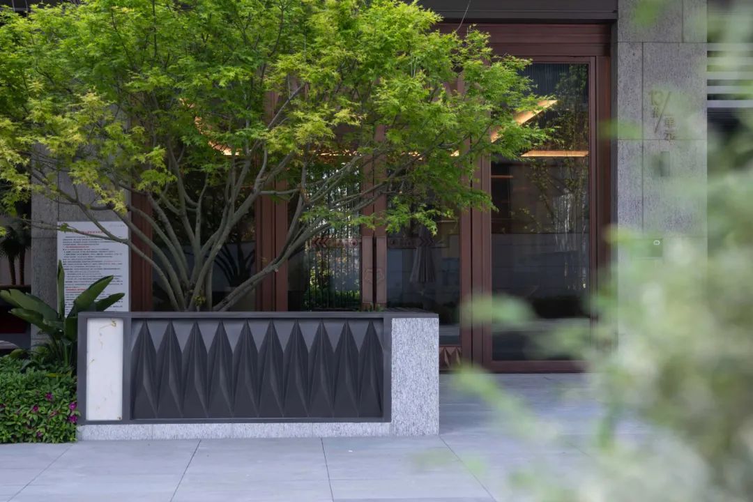干挂石材墙面结合金属灯带、项目logo,搭配围墙前的绿化花池景观,使围墙更具质感,呈现独特的形象展示效果,突显品质。