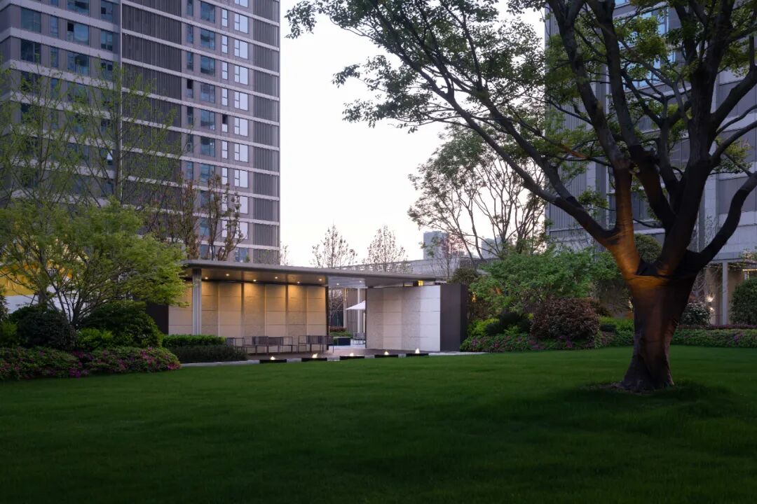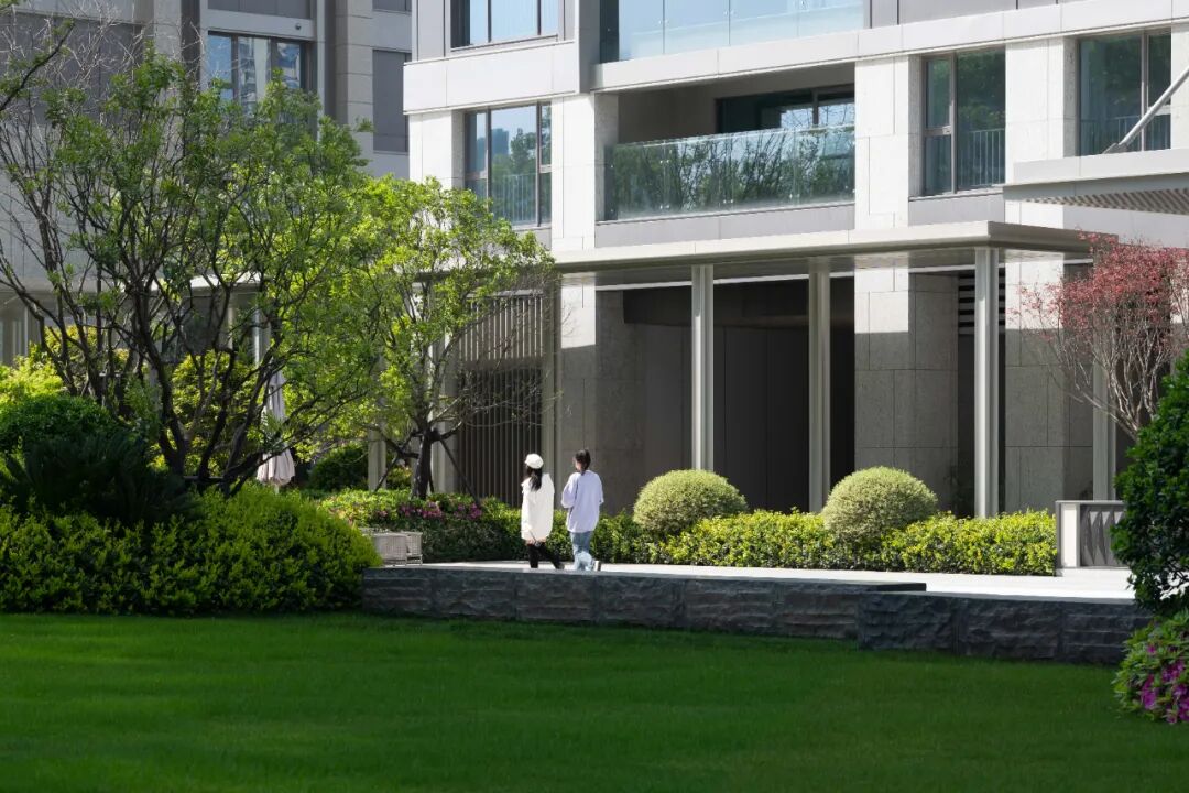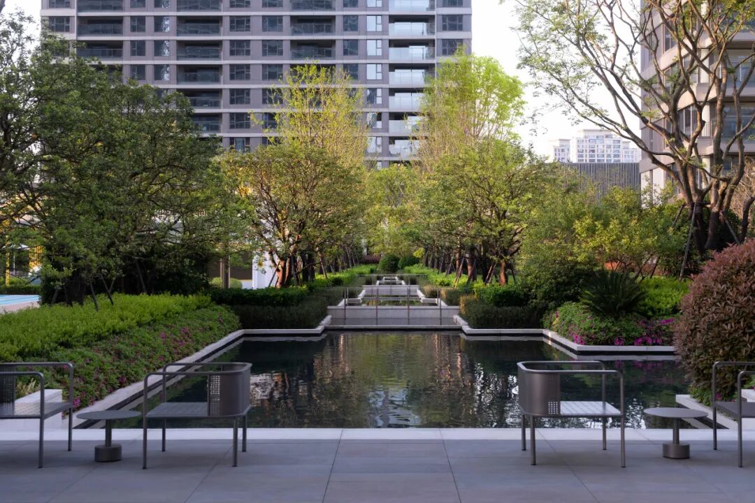 设计结合材质、色彩、植物等的细节表现,通过长廊光影节奏的变换、多维水景空间的营造、花园会客厅的艺术化处理,将城市记忆与生活美学融入社区居住体验,引领人们抽离城市的喧哗,沉浸在缓慢宁静的时光中。