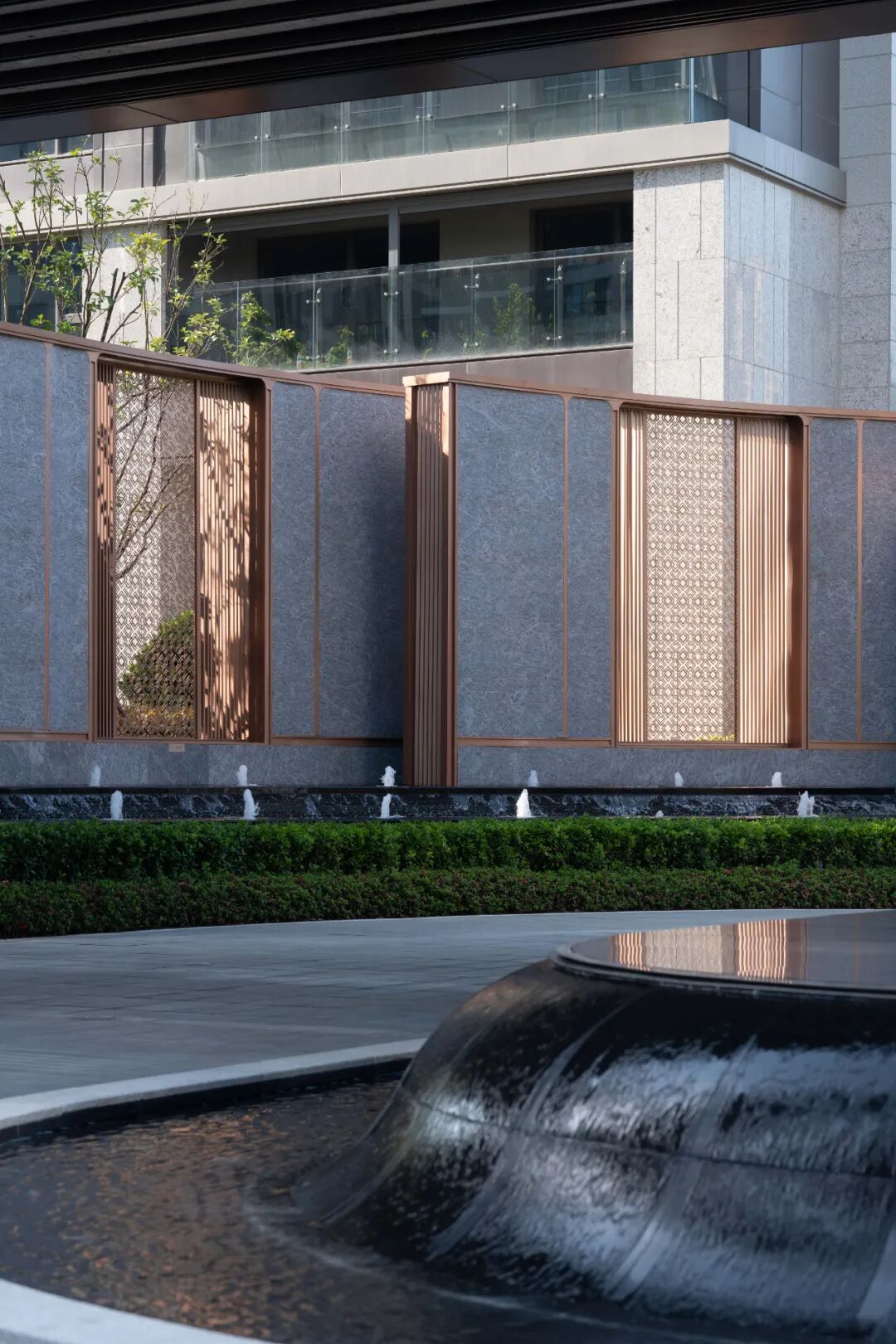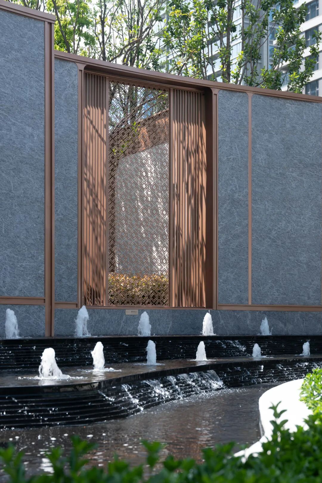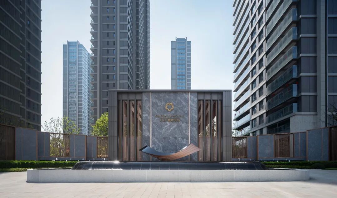 社区入口景墙立面采用进口印度宝蓝石材,搭配仿铜不锈钢;提炼抽象化的瓯绣纹理,运用在景墙与水景的设计中;精致细腻的回纹格栅屏风,虚实交叠;整石加工的圆形出水口,采用黑金沙石材。