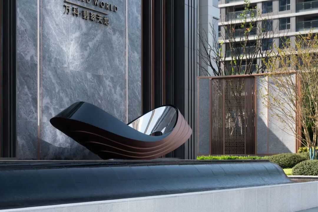 翡翠切割般的入户景墙,采用定制异形不锈钢外包发纹面仿铜处理,搭配浪花白细凿面花岗岩和米白色透光云石板,不同材质的碰撞,打造独特的艺术与典雅魅力。