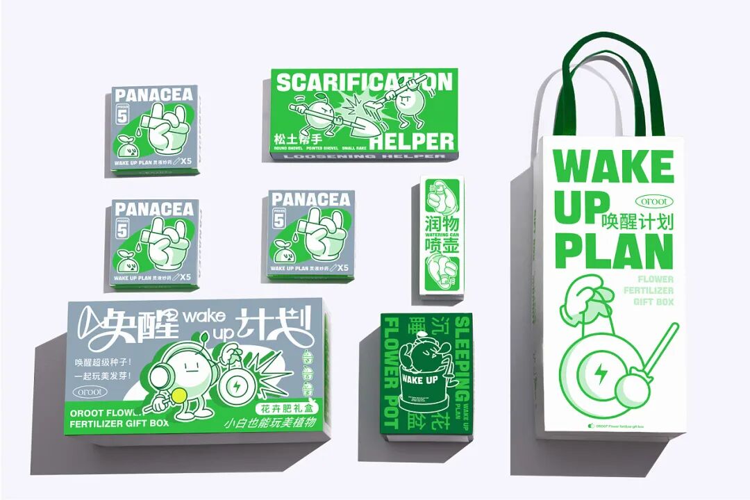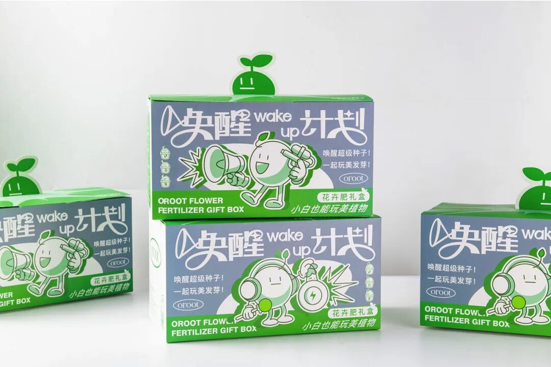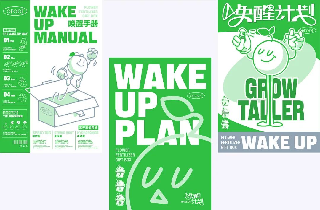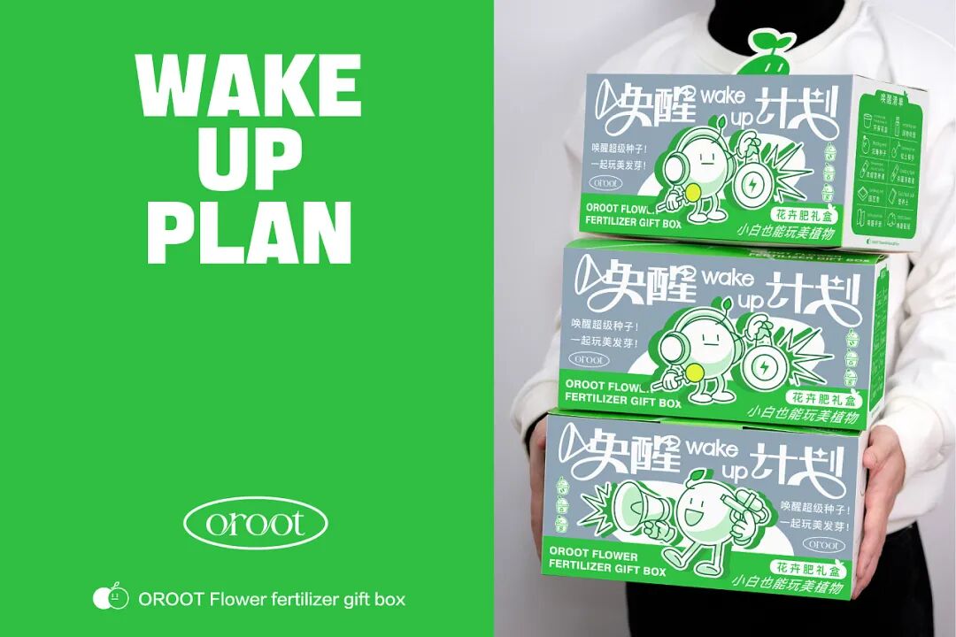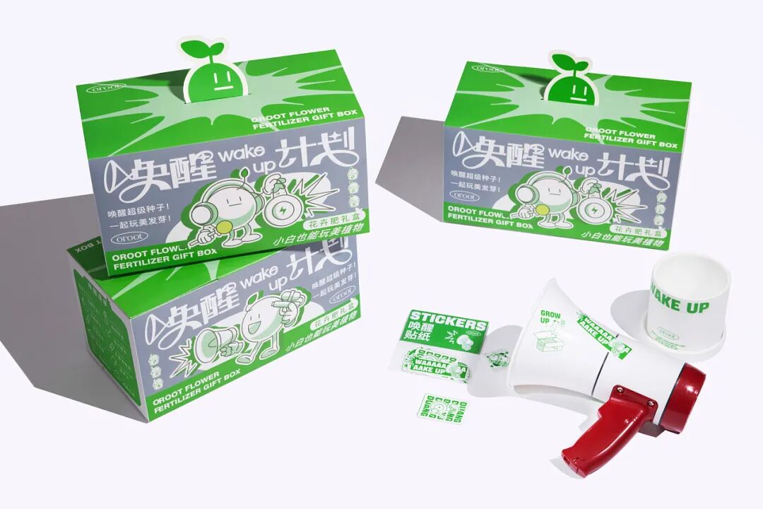 一款有趣的花卉肥料礼盒包装,以“唤醒计划”为主题,在故事的背景中,可爱的种子通过敲锣、喇叭等的方式都没有唤醒另一颗种子,最后使用了产品“营养液”才得以成功唤醒,最后生长出植物。在表达了产品的同时,也介绍了整个礼盒的玩法,更能得到年轻消费群体的喜爱~
