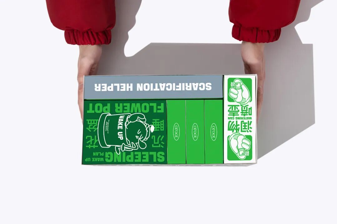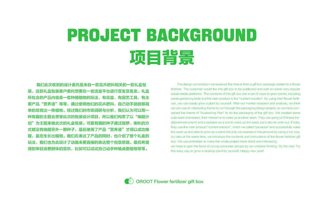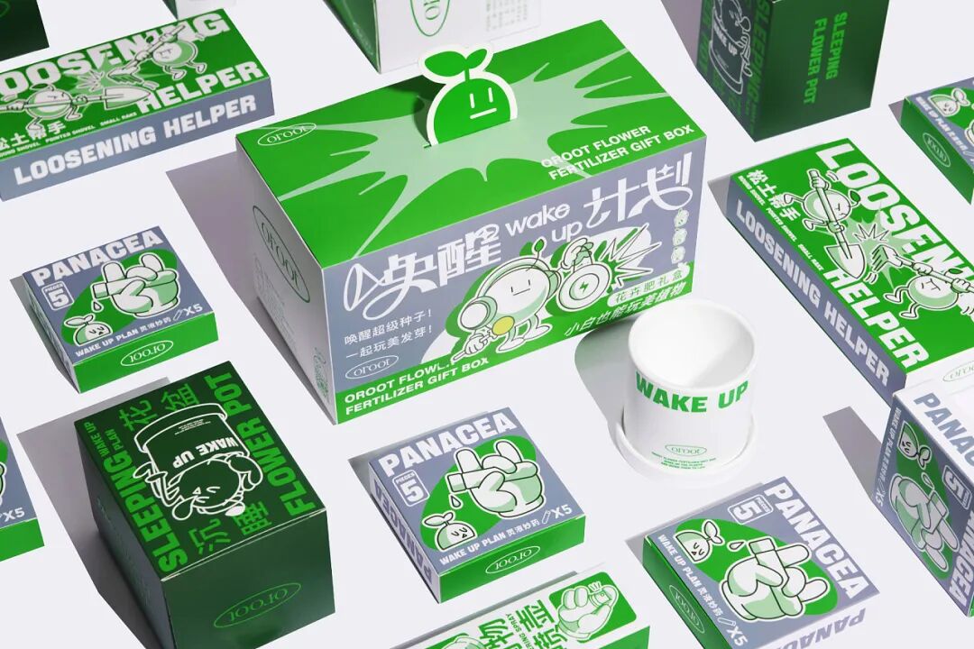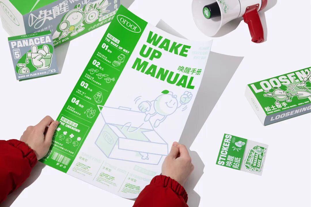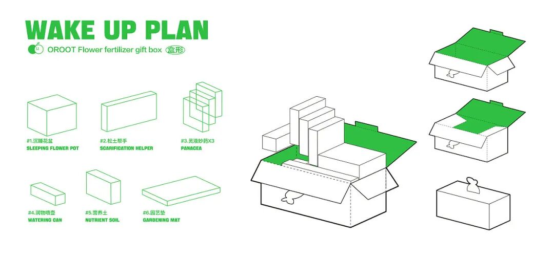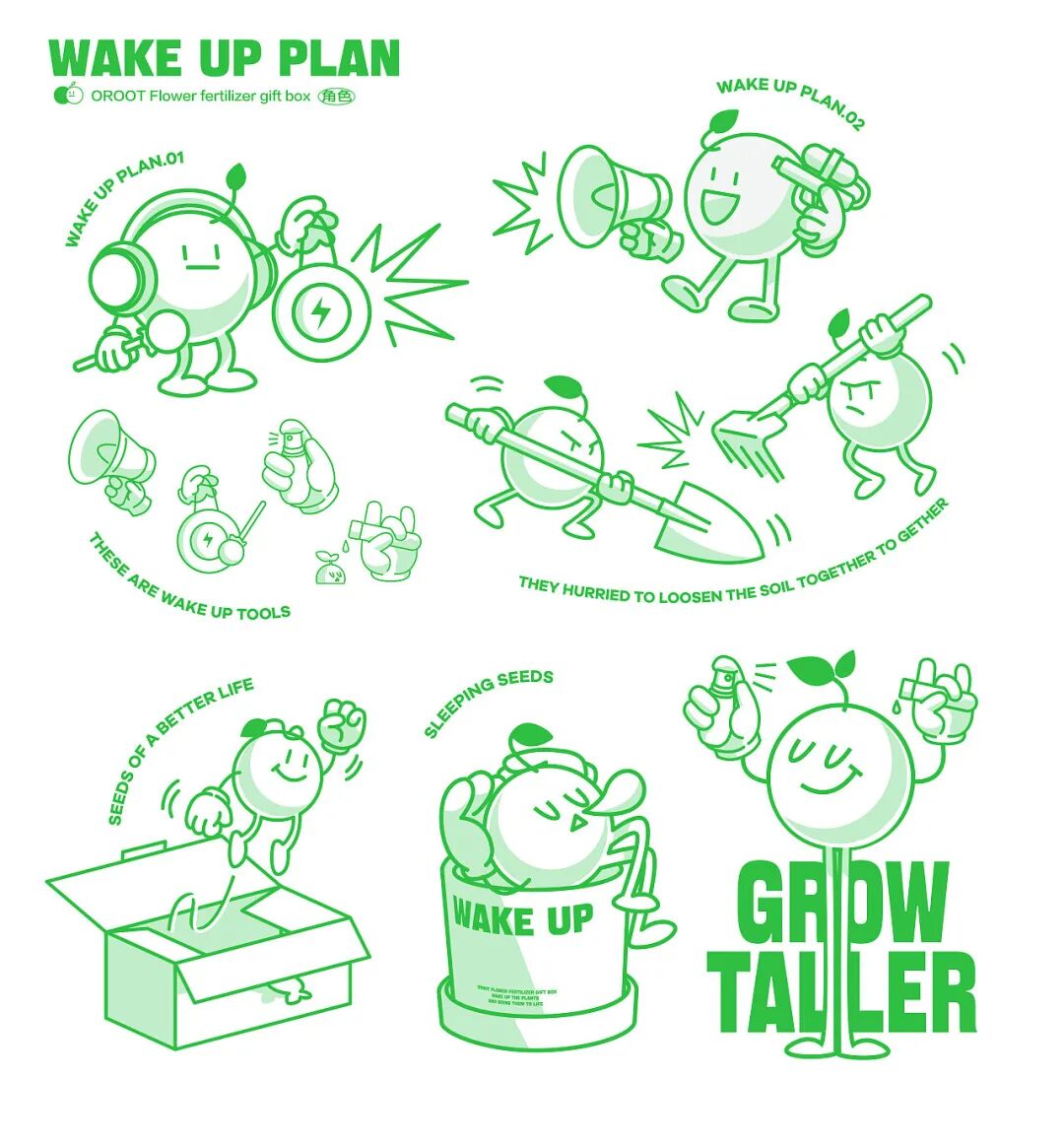 一款有趣的花卉肥料礼盒包装,以“唤醒计划”为主题,在故事的背景中,可爱的种子通过敲锣、喇叭等的方式都没有唤醒另一颗种子,最后使用了产品“营养液”才得以成功唤醒,最后生长出植物。在表达了产品的同时,也介绍了整个礼盒的玩法,更能得到年轻消费群体的喜爱~