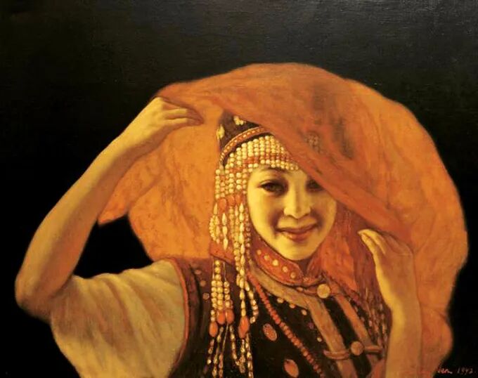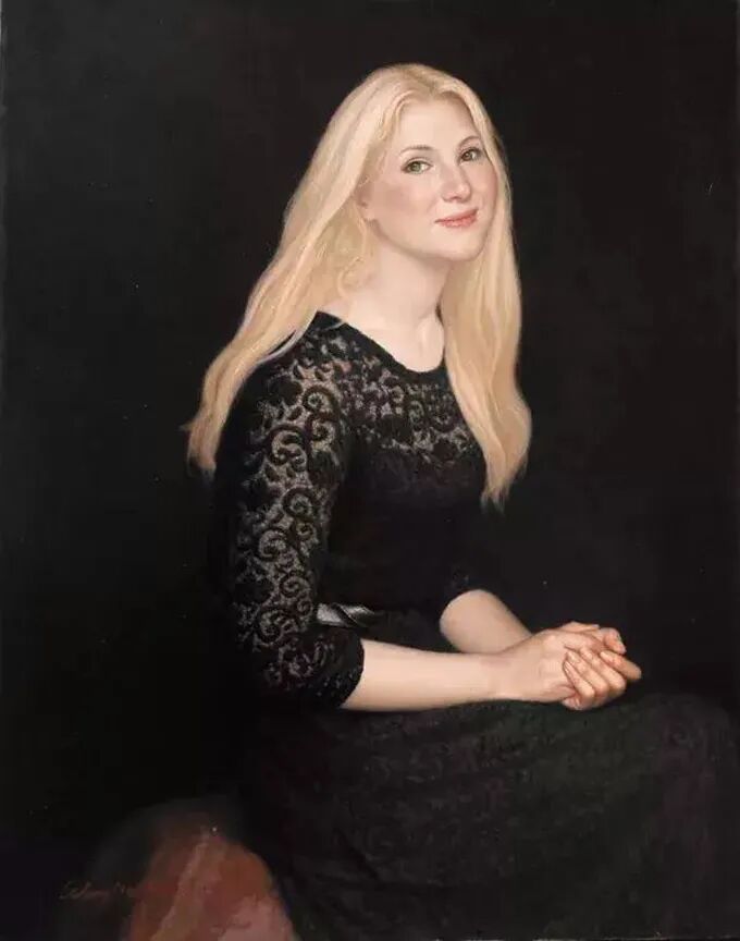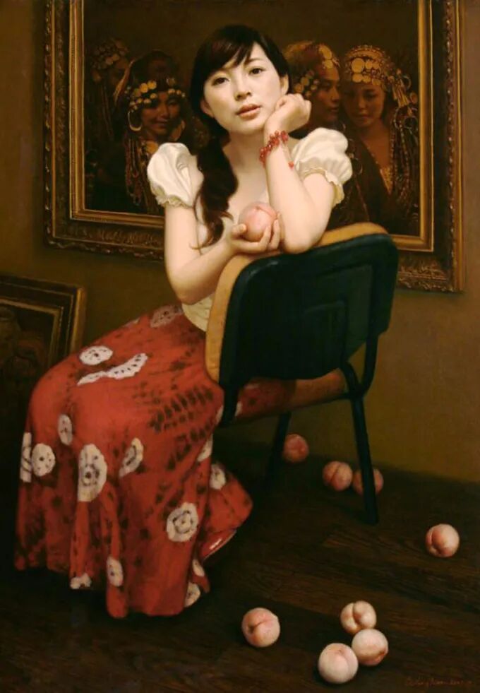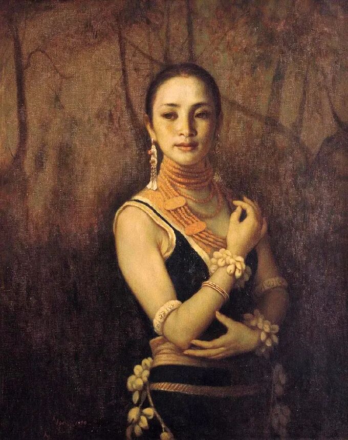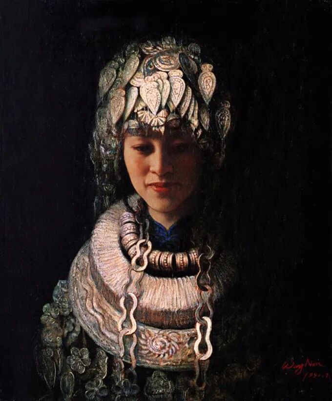 王嫩作品中塑造的美人,体态娇柔而不轻,神情含蓄而不媚,肌肤凝脂而不艳,脱凡脱俗。圣洁、典雅的格调,细腻、精微的语言,表达了德国美学家莱辛“美是造型艺术的最高法律”的世界观,这无疑也是王嫩的美学观。