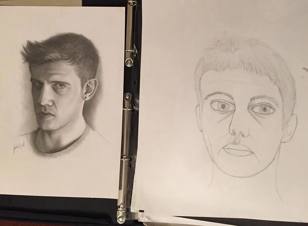 创作右边这幅时,Gavin O'Donnell只有14岁,画风非常稚嫩;而左边的则是他21岁参加天空艺术肖像画大赛时的作品。