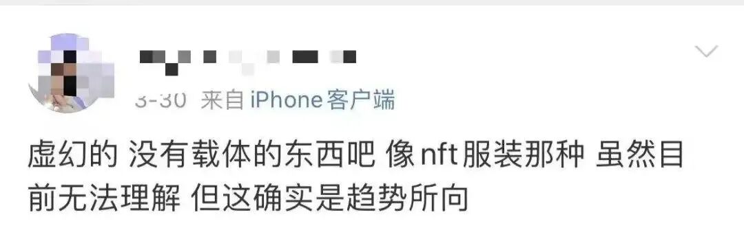 我不认为它是理财产品,如果元宇宙是一个世界,你会允许一个裸体的自己出现在里面么?服饰的本质无论是传统还是NFT只存在普通与奢侈的差别。