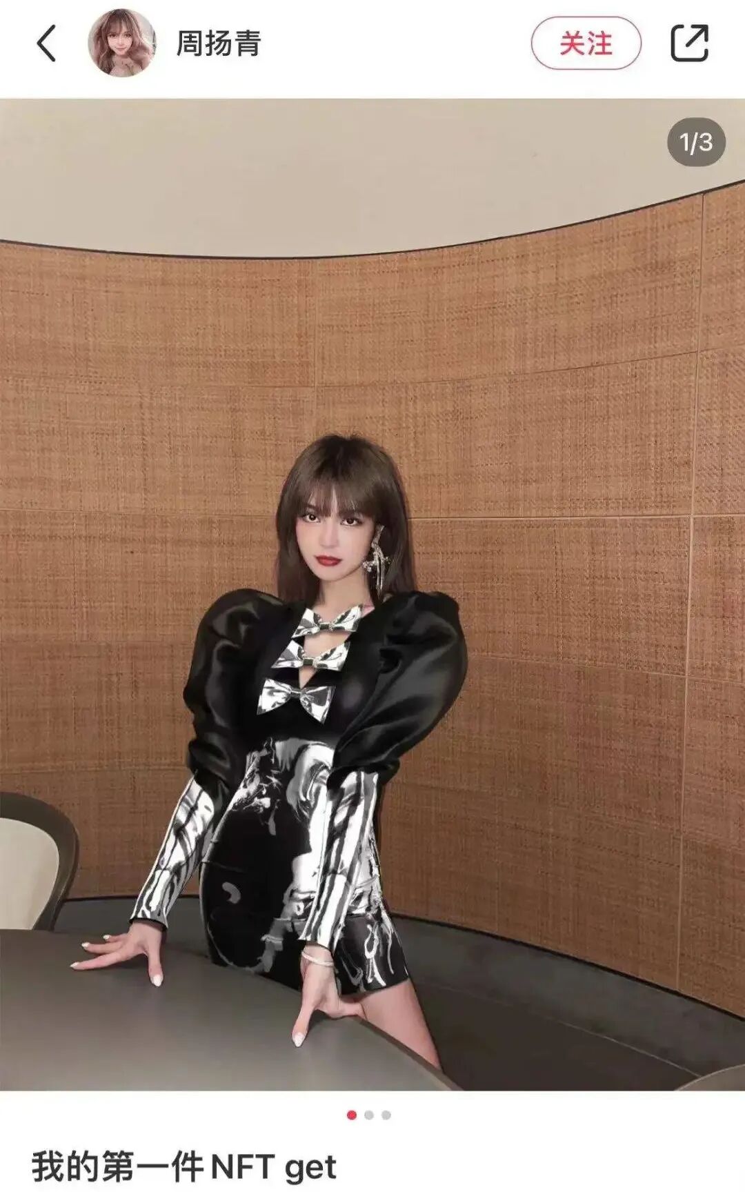 相比之下,周扬青在小红书上晒出的NFT礼服就显得常规了一些,但也离不开锡箔纸材质的蝴蝶结连衣裙以及泡泡袖黑色外套,彰显华贵。