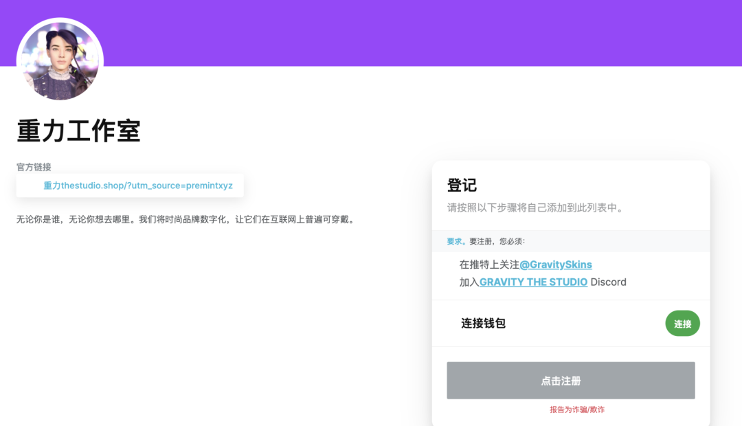 接着又费力一些力气找到了一家名为Gravity的工作室,注册的前提是要在推特和社交软件Discord上关注该工作室,并且需要通过以太坊钱包来交易。