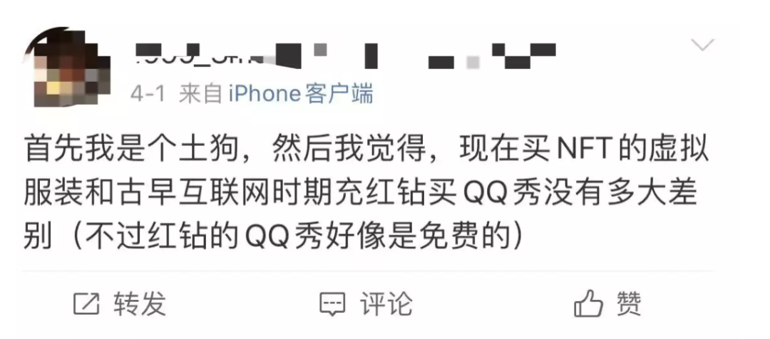 观念的区分才是本质的差异,就好比QQ秀是单纯的求“外”展示,而NFT服饰的意义在于购买者已经事先把自己的孪生意象承认的前提下求“内”的一个过程。所以这“内/外”之间既存在着本质的区别。