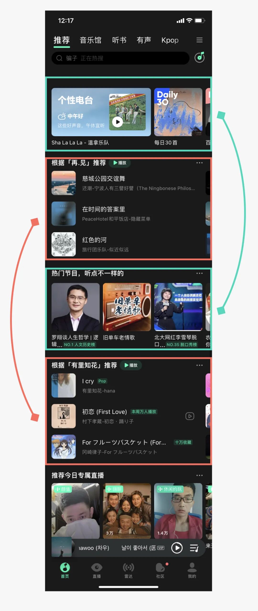 比如这个例子,同样都是听音乐,但是会用不同的排版穿插展示