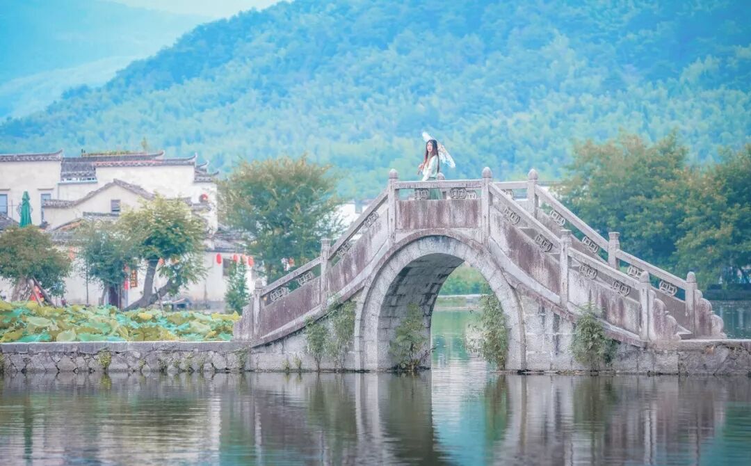湖上有桥,是一座小小拱桥,如一弯月嵌在空中一般,换个角度看时,与倒影合为一轮月,在水上摇曳生姿。顺着这一轮月往里看,便看见了蓝天,看见了白云,看见了莲花、看见了宏村建筑的倒影,看见了宏村的人。