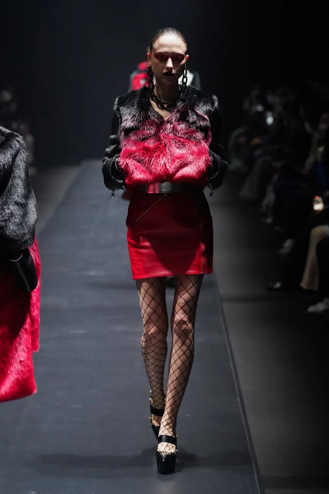 高桥还在系列中展示了一种颠覆式的风格化的女性气质,包括饰有金属环的羽毛超短裙、流苏和绣有心形嵌板的连衣裙,还有一系列有拉链的裙子。