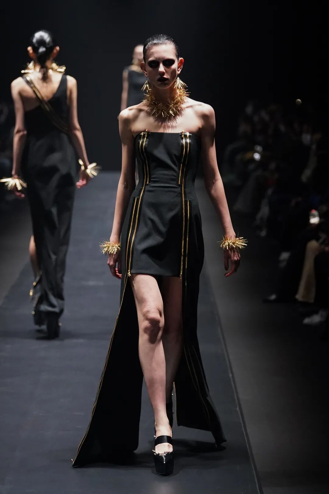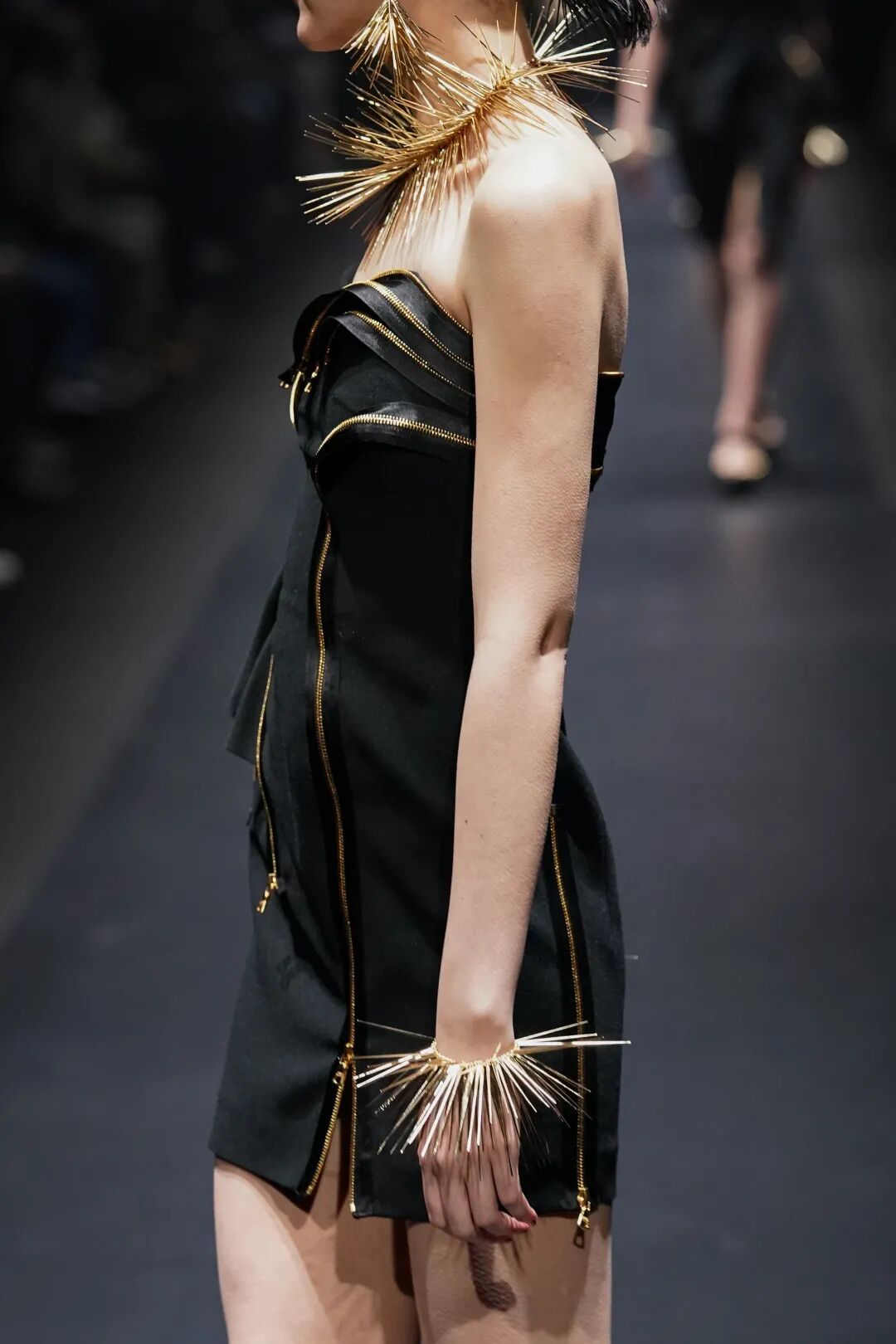黑色羊毛裙外形由金色拉链勾勒出来,呈弧形,勾勒出人体轮廓,海胆项链和手镯搭配在一起,散发着恐怖的气息。高桥说它们是由黄铜制成的,非常锋利,所以佩戴时要小心。