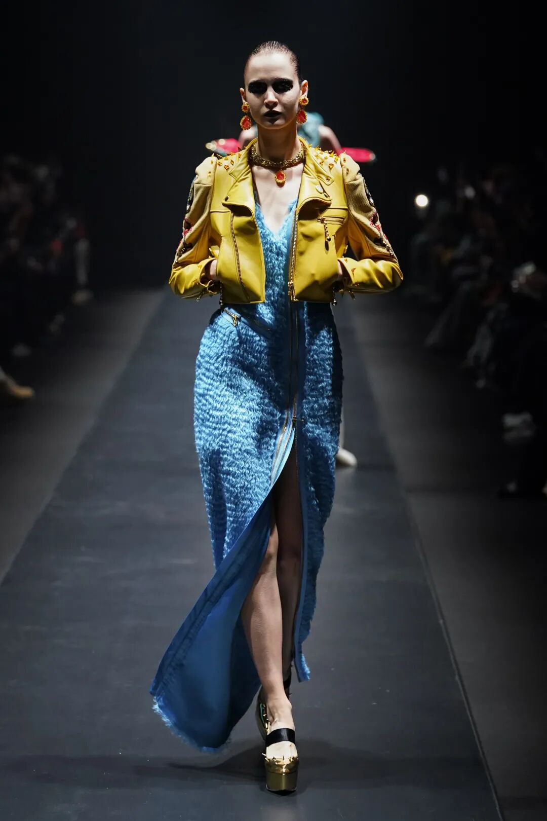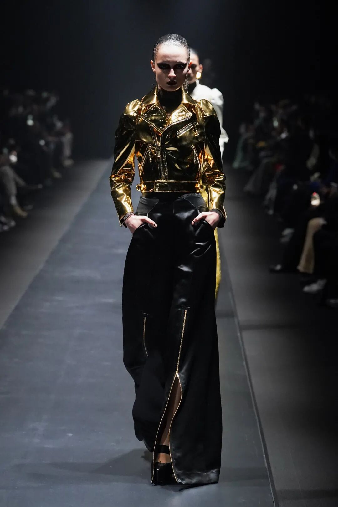 本季以一系列性感的高开衩黑色连衣裙开场,紧随其后的是端庄的象牙色长裤套装,包括阔腿裤和收腰的夹克,穿插着一些金属色单品,最后由一系列短款夹克搭配开衩羊羔毛裙装收尾。