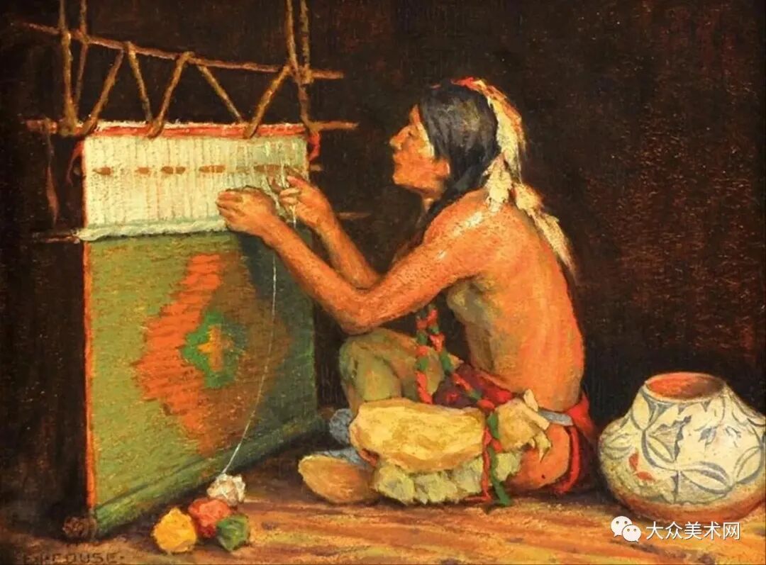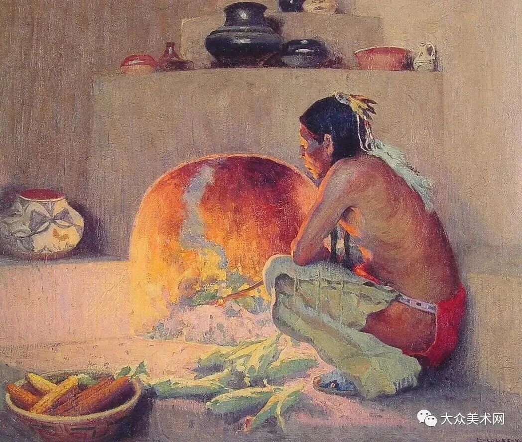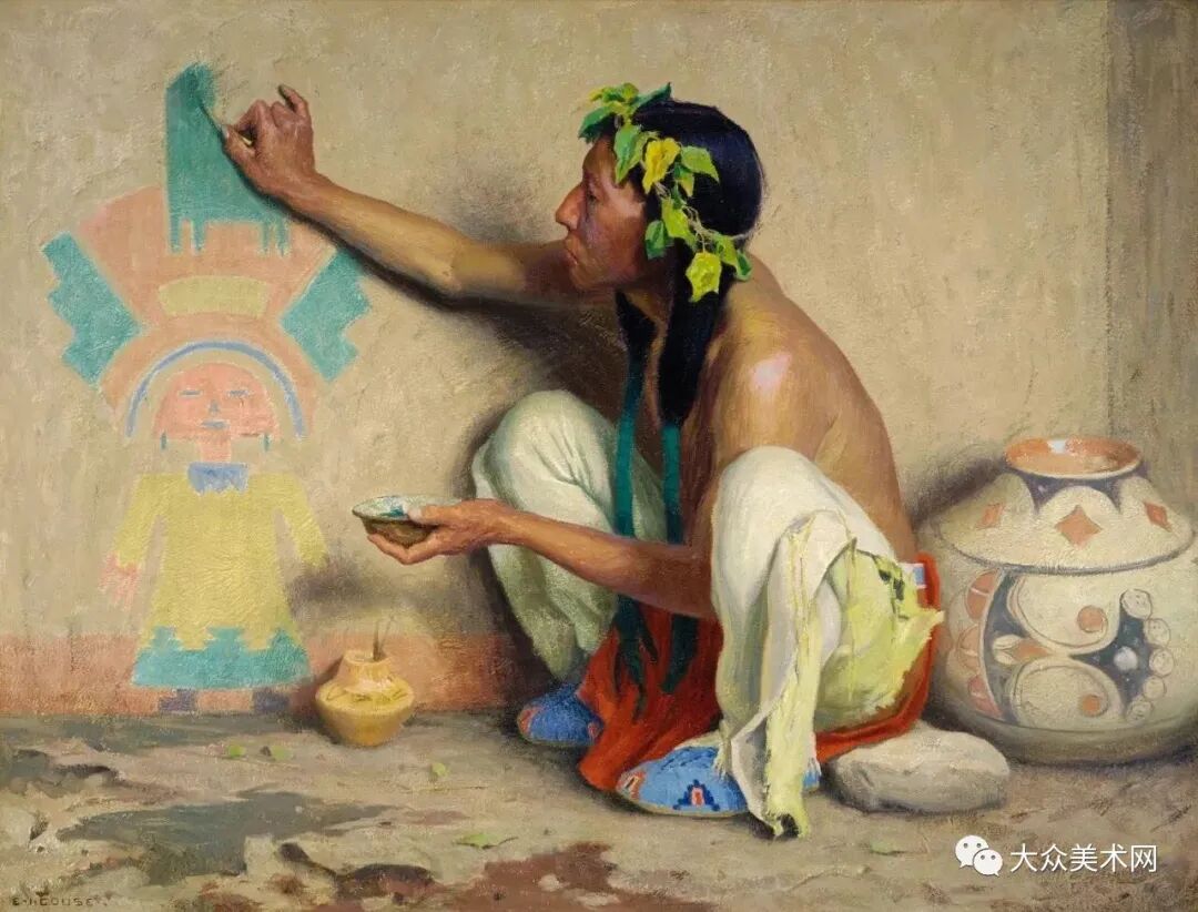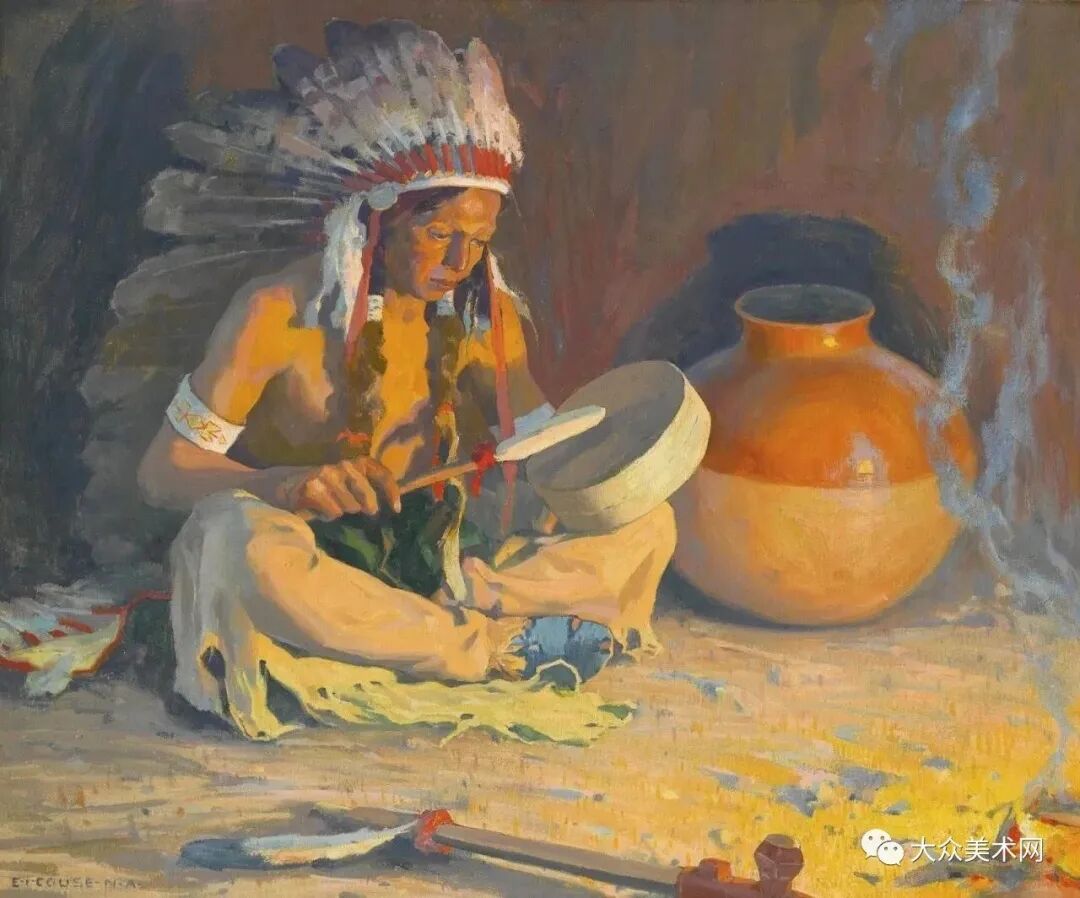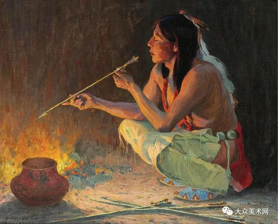 伊恩格·欧文·库斯(Eanger Irving Couse,1866-1936)是一位美国艺术家,也是陶斯艺术家协会的创始成员和首任主席。1866年9月3日他出生于密歇根州萨吉诺。奇佩瓦人住在那附近。年轻的Couse对美国原住民文化的兴趣很早就得到了发展,他的艺术本能也得到了发展。画美洲印第安人成了他毕生的志向。
