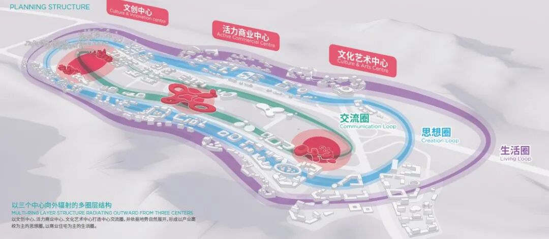 中心临近生态廊道,放置活力开放的复合组团,包括拥抱河流农田的艺术文旅复合组团,公共性与创新性兼具的艺术高校组团,与生态绿带相结合的文创产业组团,保留地方特色的乡村文旅组团。两侧地势较高,设立静谧舒适的生活居住组团,包括集零售商业为一体的市民居住组团,与艺术院校配套的高校生活组团。规划结构以三个中心向外辐射的多圈层结构。一心一廊两片四轴线的景观结构,打造水岸相伴的生态走廊,还原乡野田园风光。