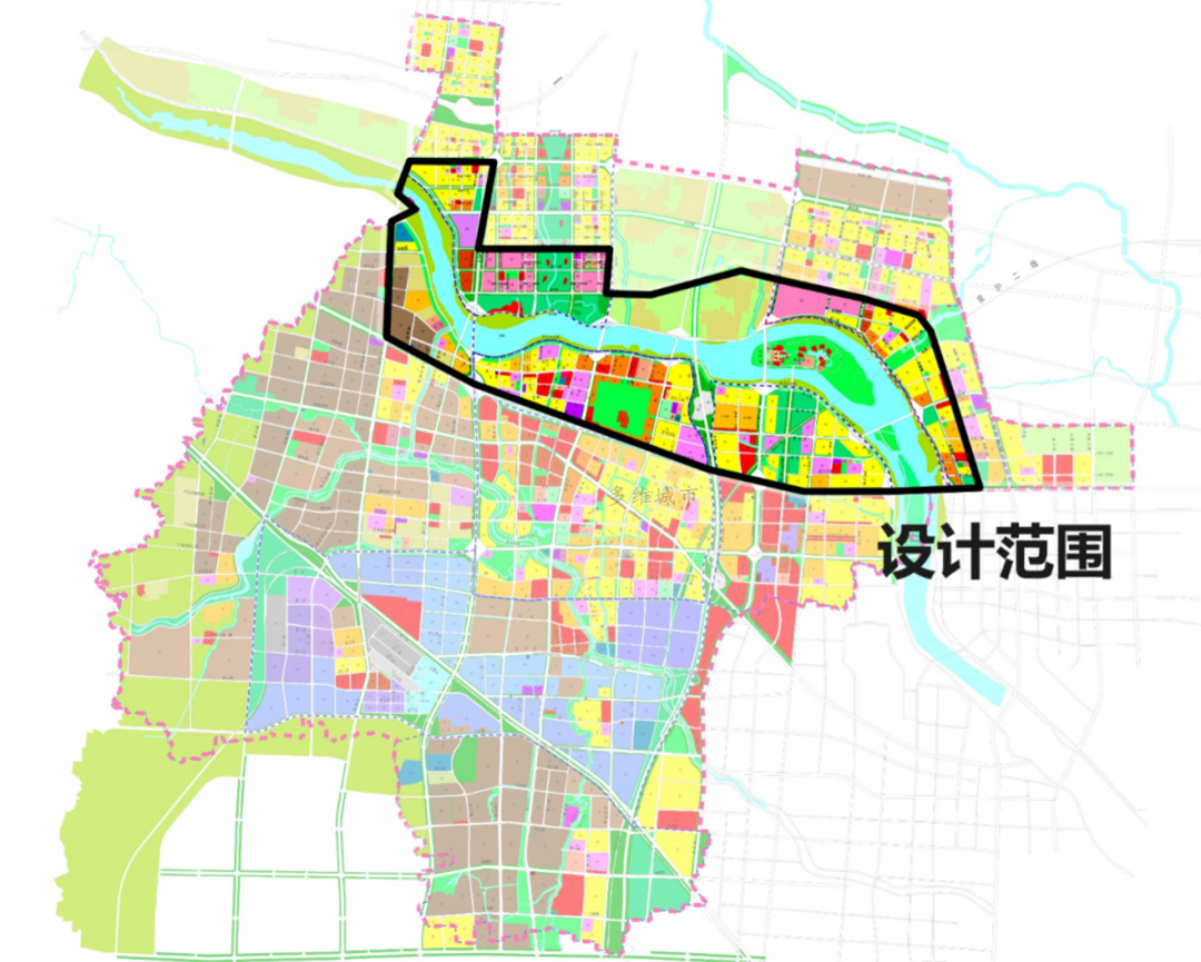 设计范围以祊河左右河岸向外拓展约1-2km不等的范围,并包含临沂商谷核心区,面积共计约40平方公里(其中屠苏岛面积2.32平方公里,陆地面积约28.43平方公里,水域面积约9.25 平方公里)。