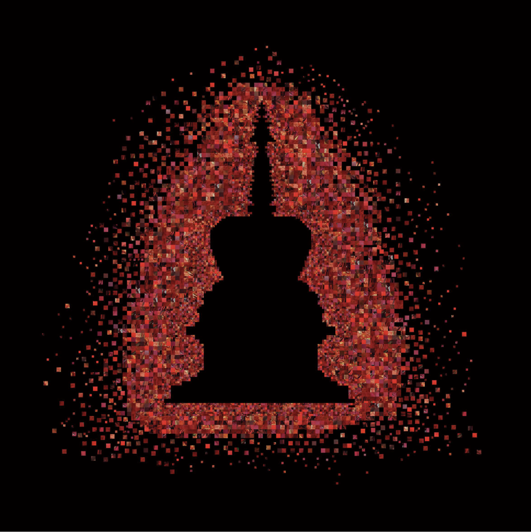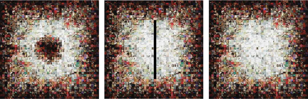这张示意图展示的是原创绘画作品与数字艺术作品之间的联系。在重新构成的画面中,每个色块都可以索引到原画的局部图像。