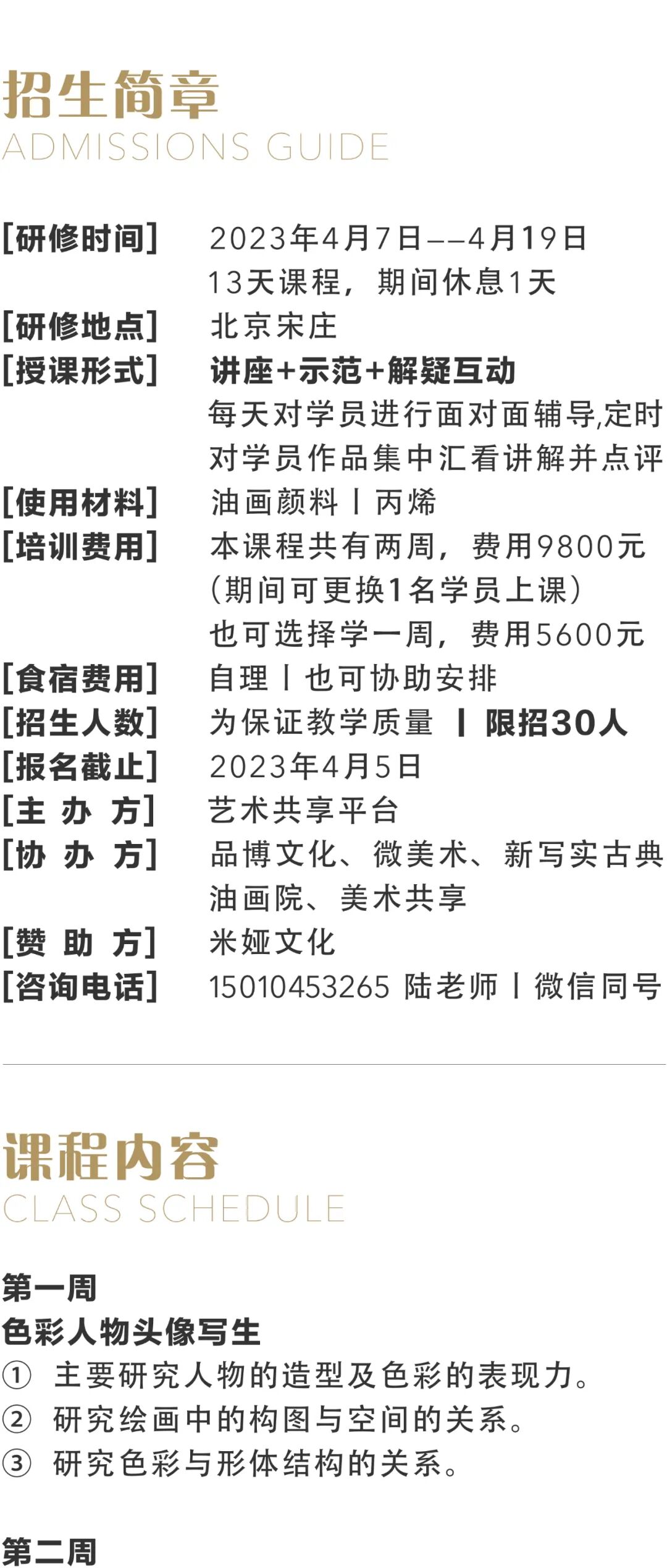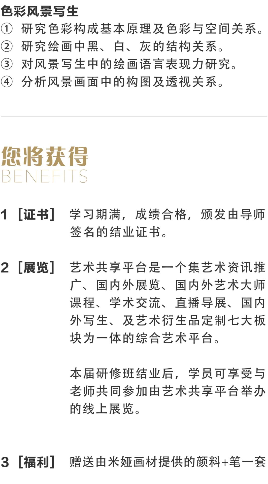 研修班以色彩艺术的探索、研究为宗旨,通过色彩人物头像及色彩风景的专业写生学习,使学员更了解具象色彩创作的原理、构成及表现,通过对具象表现绘画的结构、造型、色调、语言的研究,了解前沿的色彩创作研究动向与理念,提升创作能力。同时为了顺应艺术联考制度的改革,本课程还对风景写生中绘画语言的构图及表现力展开了研究,综合的学习内容为繁荣新时代的艺术创作事业培养更多的优秀人才。