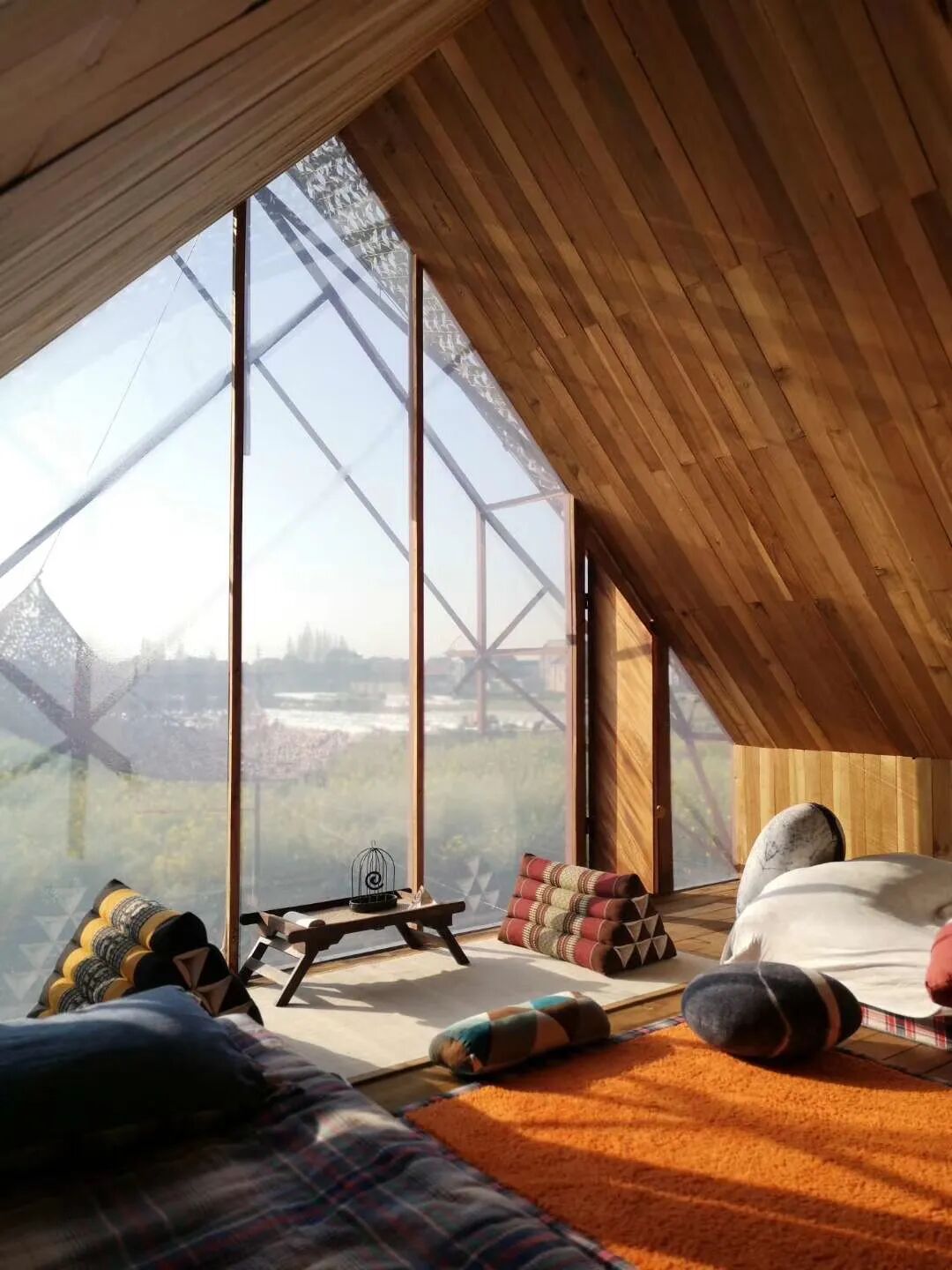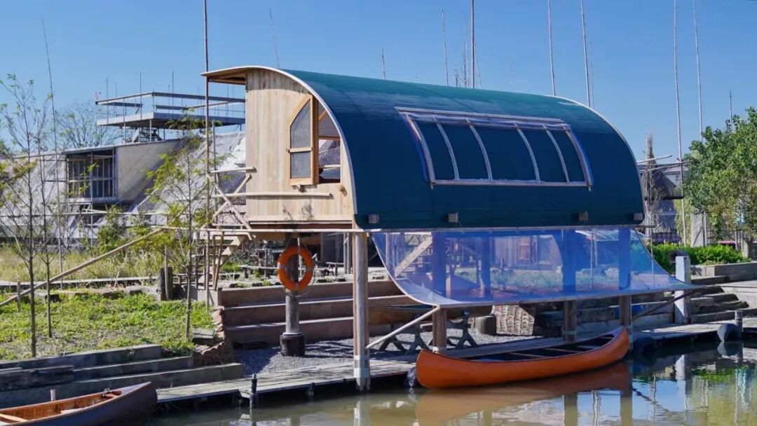 他为每条可以下水的船都配好了“码头”,每个“码头”又搭配一个雪松船屋,可供数人休息、过夜,如同一个水边的民宿。雪松的木香似有若无,也很疗愈。船屋没有空调,但大多拥有直面稻田的大翻窗甚至十几扇门窗,通风无碍。有的船屋甚至在地面开了条窗,能看见下面经过的行船。