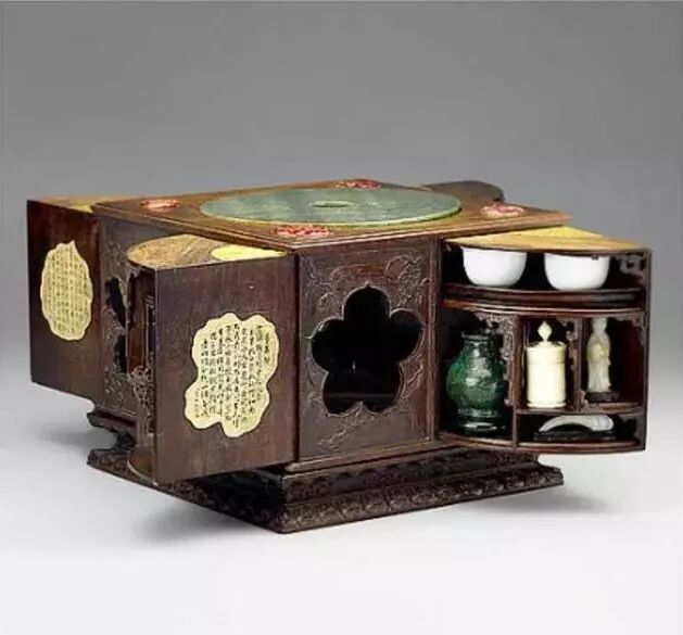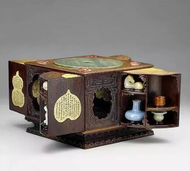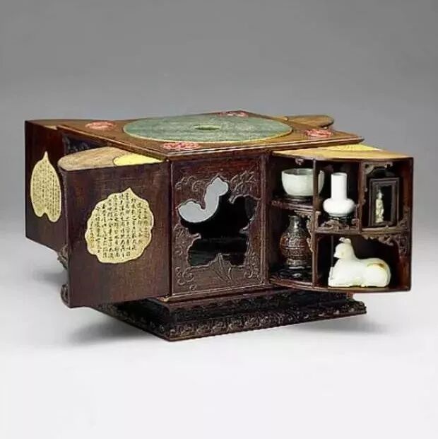 据说,有些设计巧妙的多宝格,让人即使看到格中、抽屉里或隔板旁有宝物,也因找不到机关而拿不到。