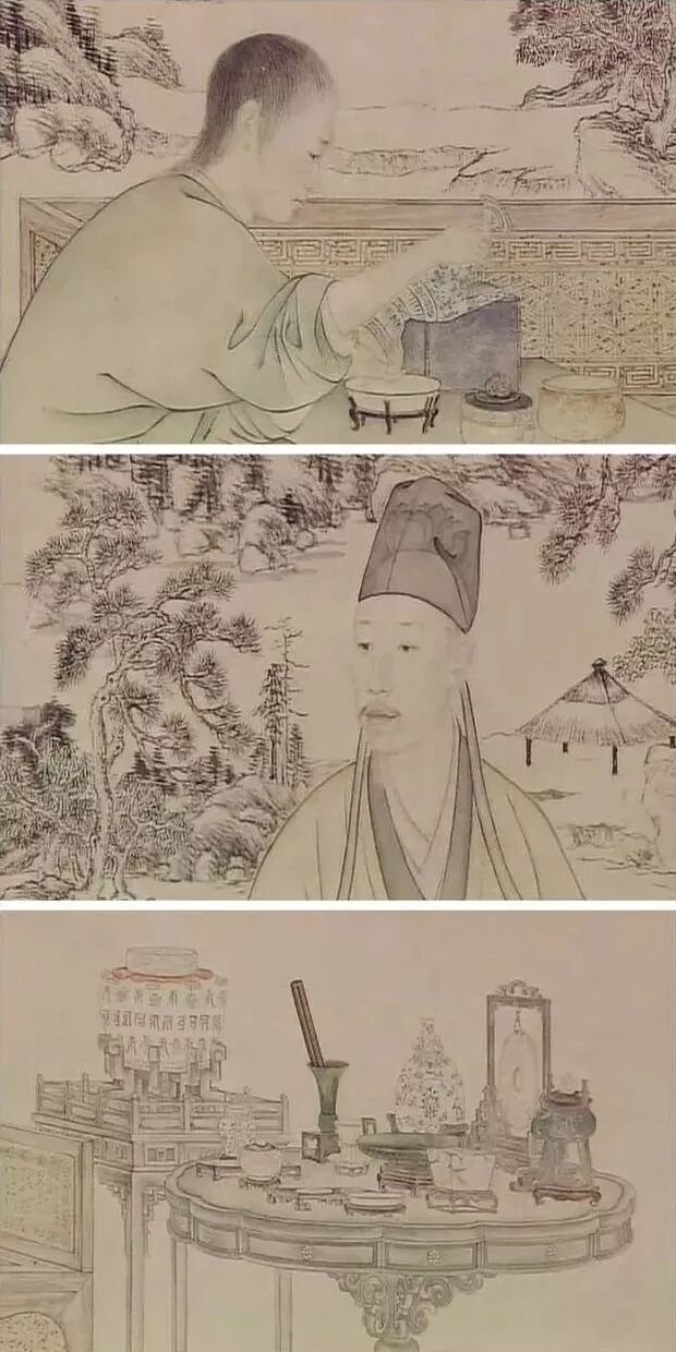 (《乾隆帝是一是二图轴》郎世宁 作,表现了乾隆皇帝鉴赏古物的情景)