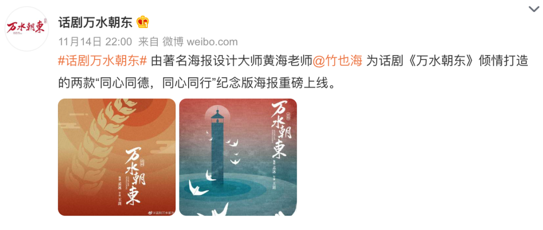 最近话剧万水朝东,公布了由海报设计大师黄海老师,设计的两款纪念版海报“同心同德,同心同行”。