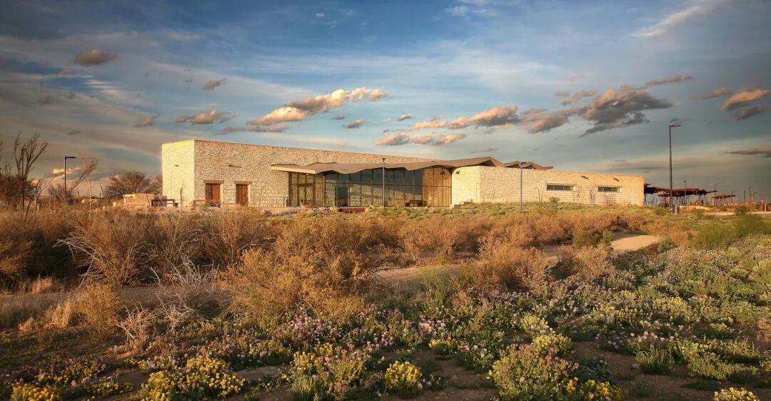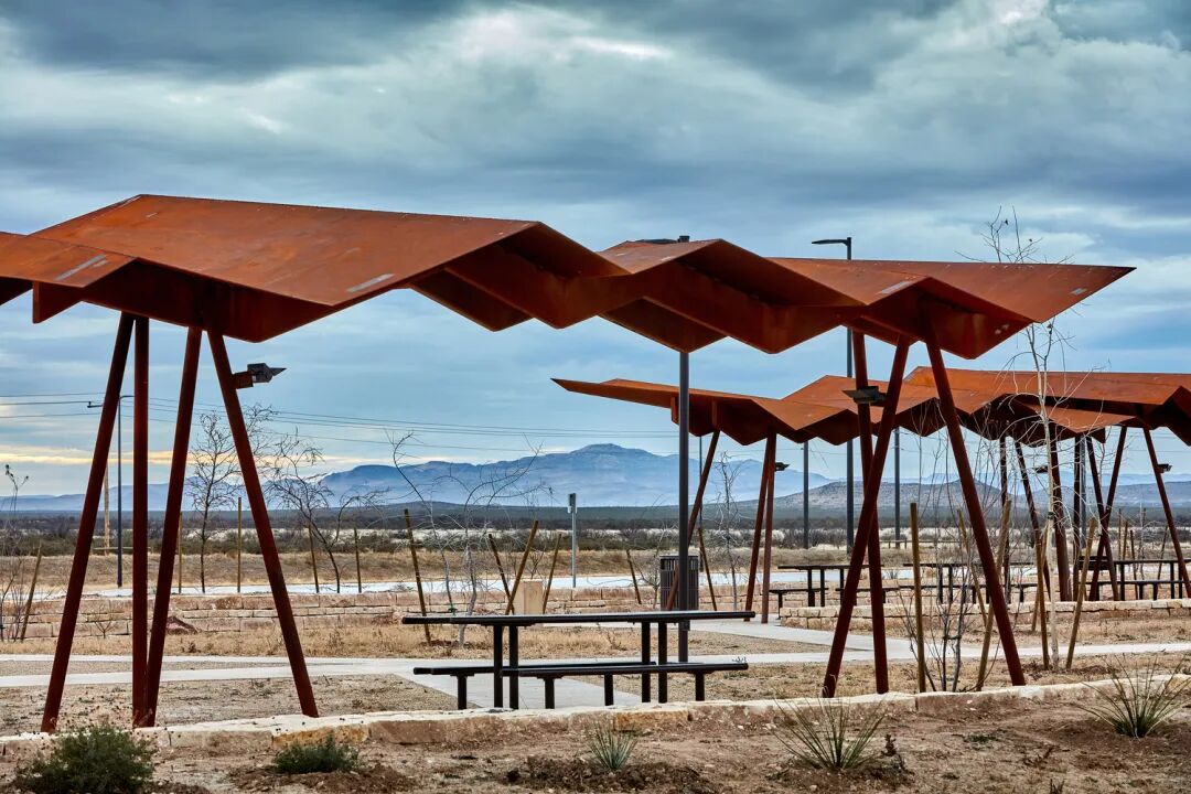 设计来源于德州西部奇瓦环沙漠地区的地质、生态和文化历史。该项目包含了多种复杂功能空间,旅游公共卫生间、自助售卖区、文化历史展览、野餐区、游乐区、田野小路,以及停车区,为那些在西海岸和东海岸之间的10号洲际高速公路之间穿行的疲惫的司机提供休息之处。