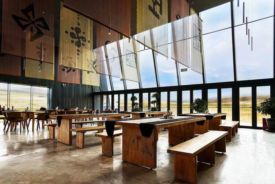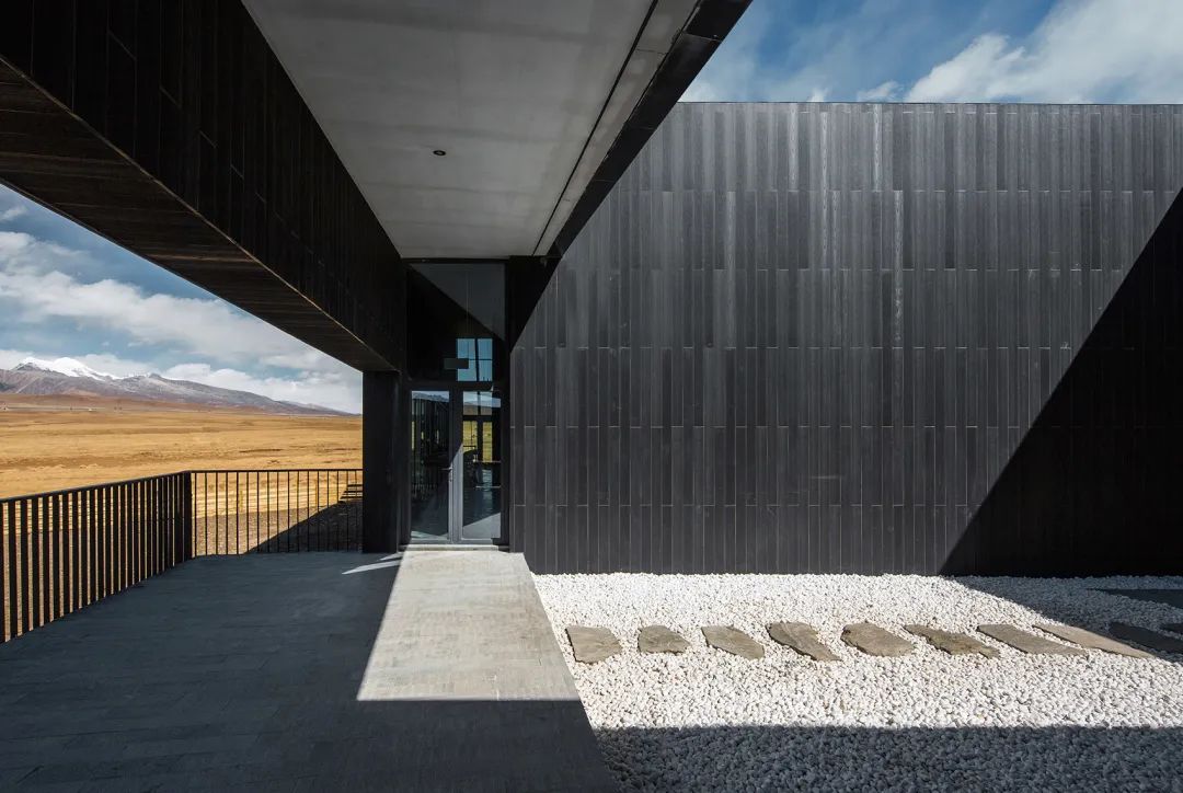 建筑主入口处是一个下沉广场,建筑形体从这向两端逐渐升高。起伏的形体,结合建筑立面采用的黑色塑木板,仿佛从地上生长起来的一个黑帐篷。”V” 字型的空间布局,向外打开,拥抱着羌塘草原和对面起伏的群山,将无限风光尽收眼底的同时,也自然而然地融入了整体自然环境。